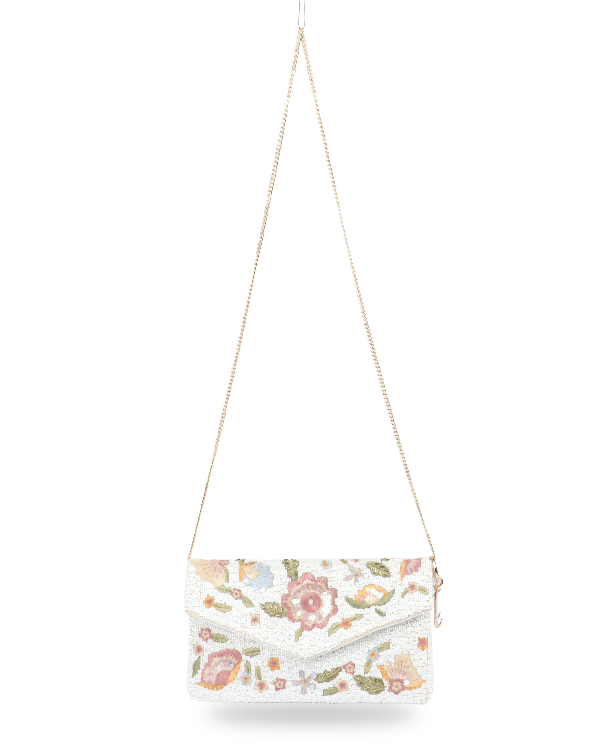 This romantic envelope clutch is hand-embroidered with white beads and delicate pastel floral motifs. Finished with sequin accents and a detachable gold chain, it adds a touch of vintage elegance to any daytime or wedding outfit.