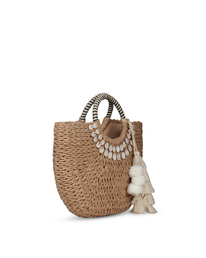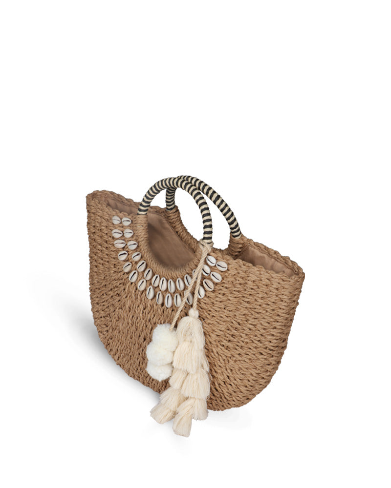 Artisanal elegance with our Bohemian Shell Bag, a true testament to relaxed, free-spirited style. The intricate raffia weave is beautifully complemented by a delicate fan of cowrie shells and a unique striped handle.