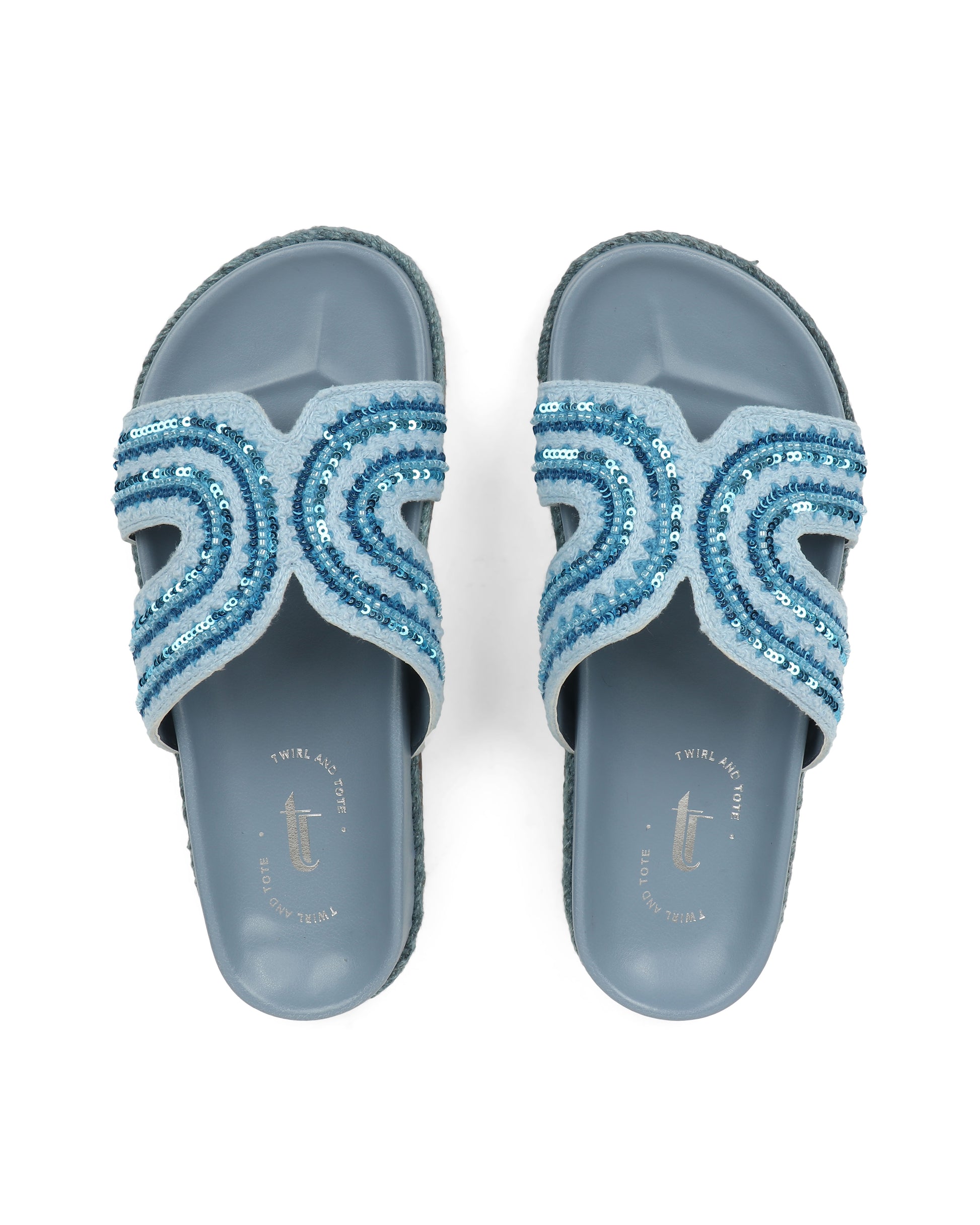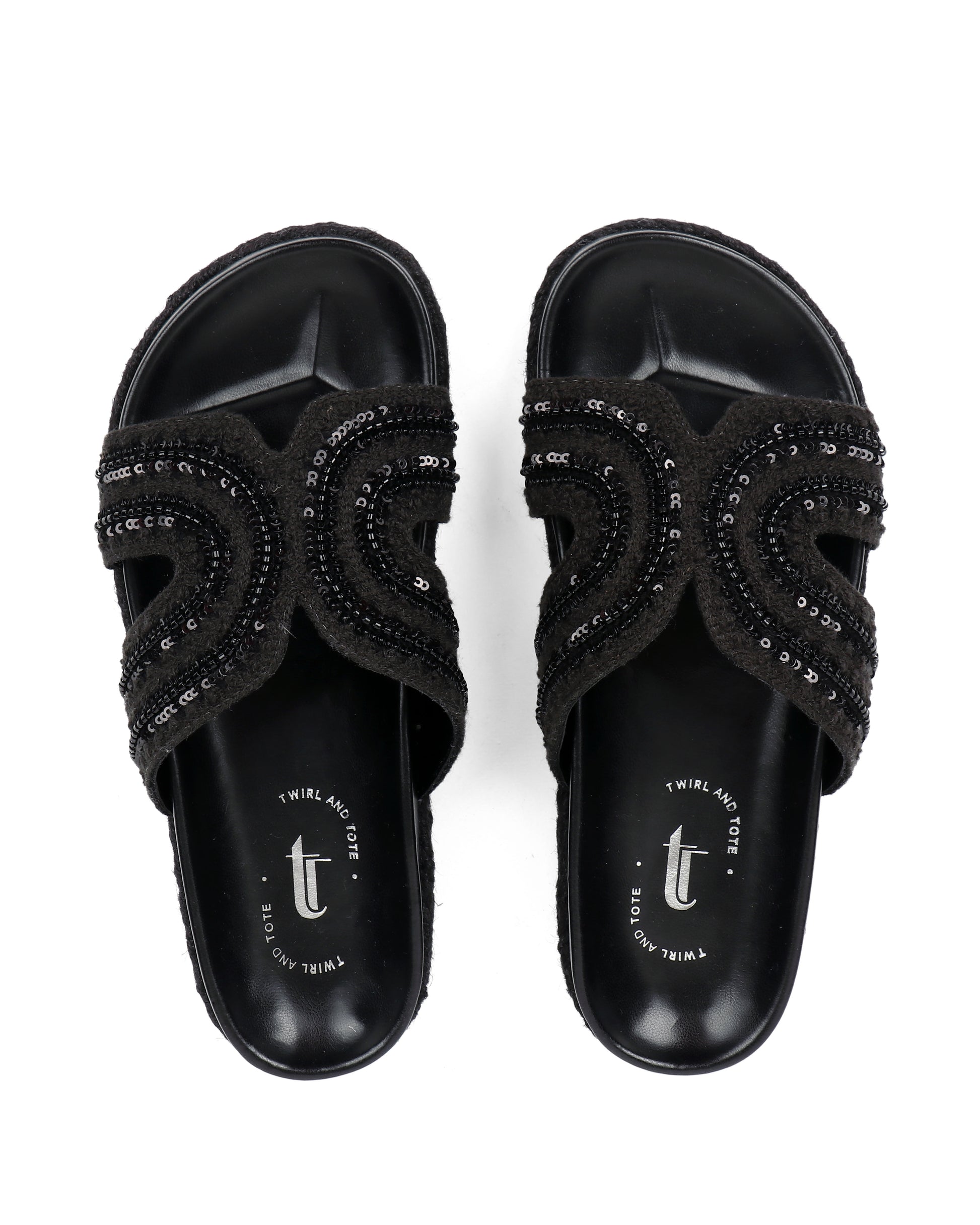 Slip into comfort and style with these sparkling sliders featuring shimmering wave-like sequins. Perfect for a relaxed day, these sandals offer a blend of casual ease and a touch of sparkle, making them an eye-catching addition to your wardrobe.