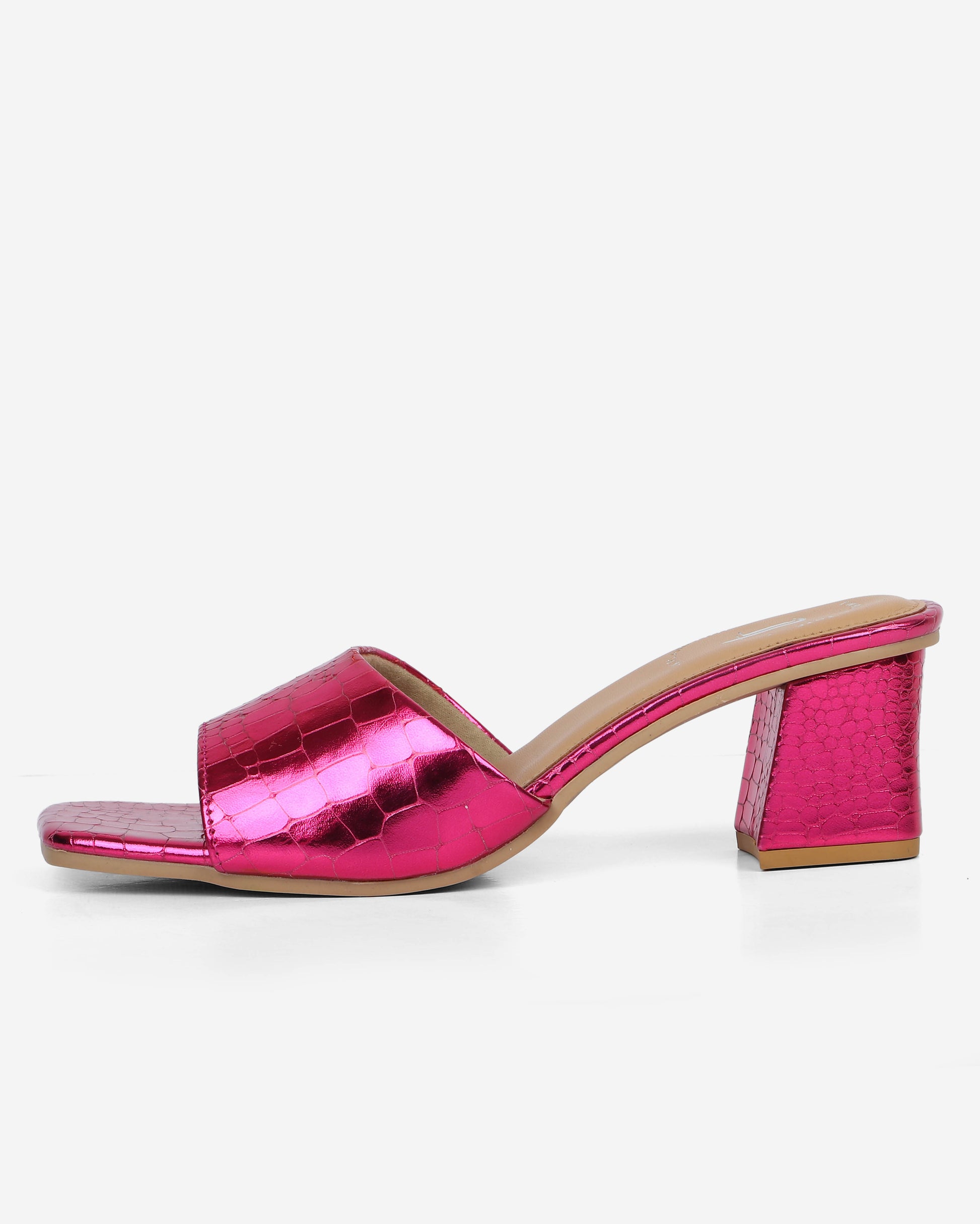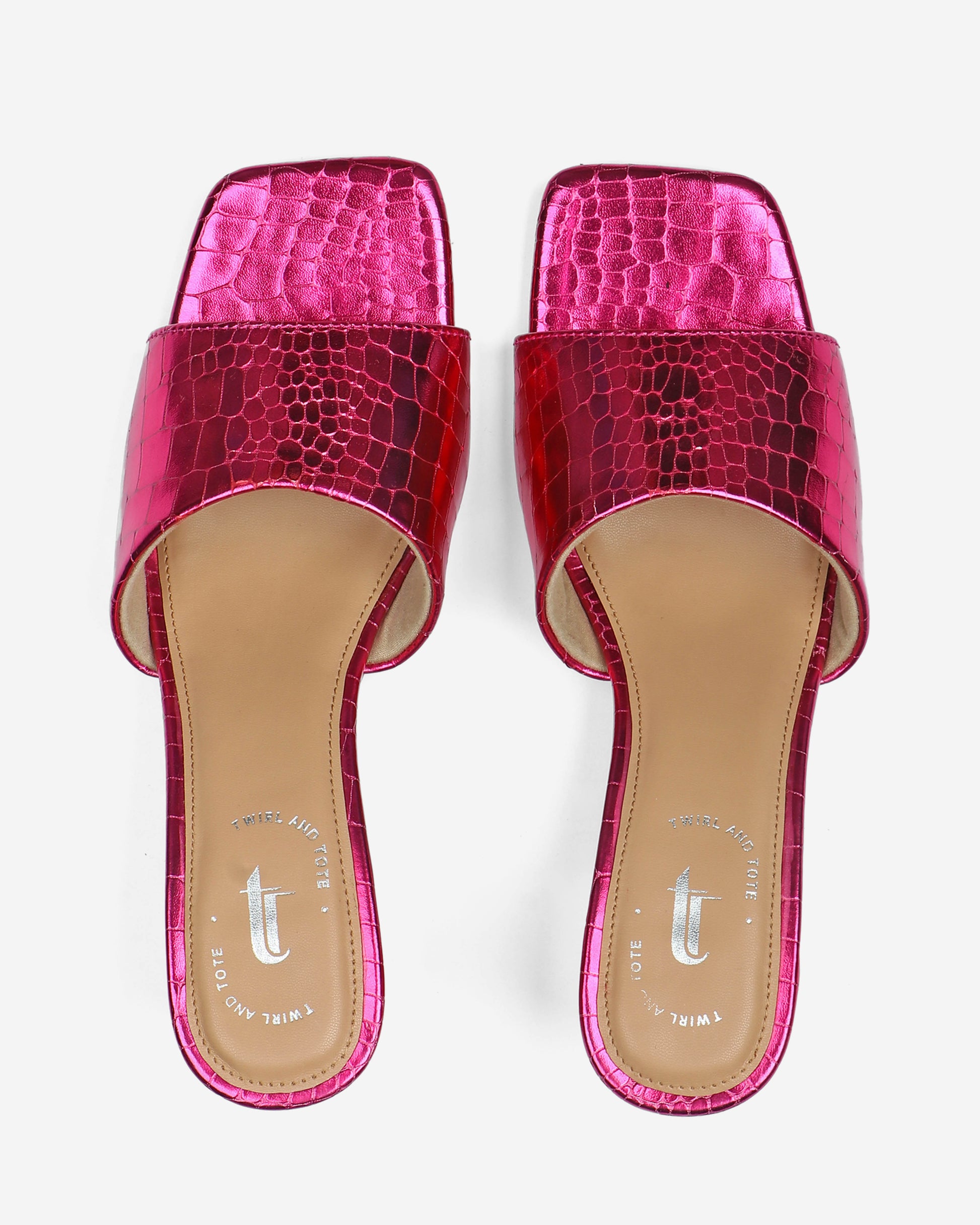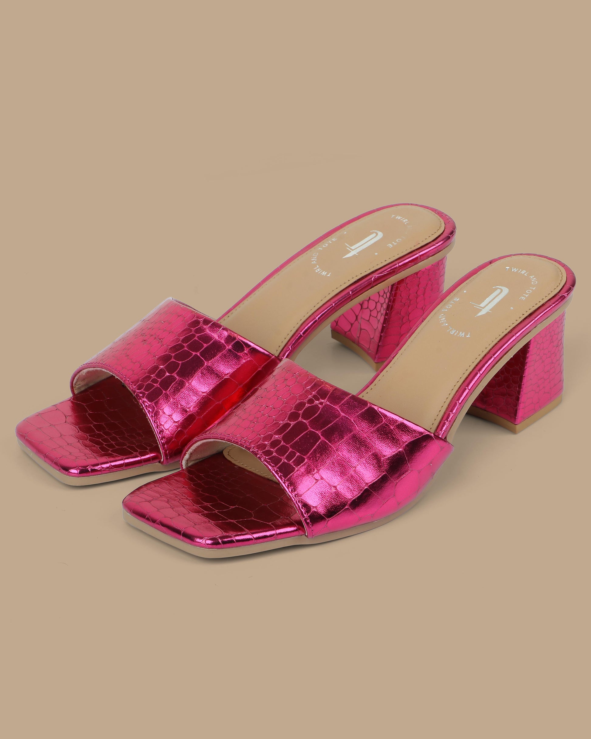 Embrace a touch of glamour with 'Crimson Chic', the perfect mules for a statement look, featuring a lustrous metallic finish.