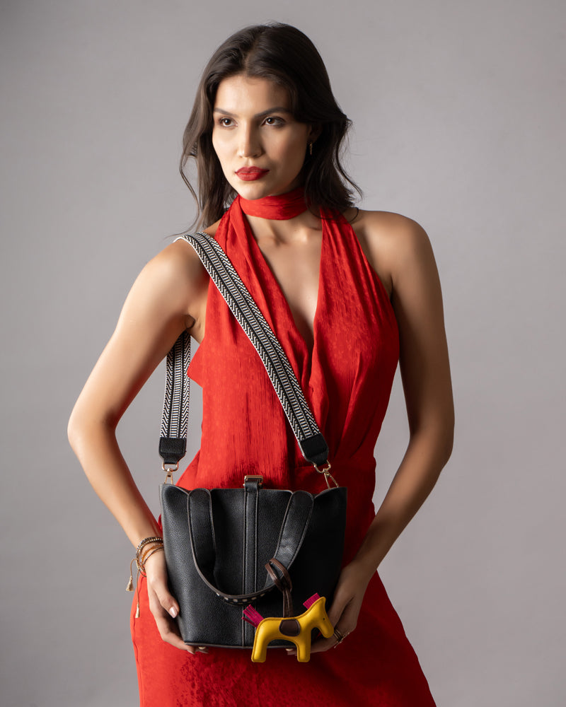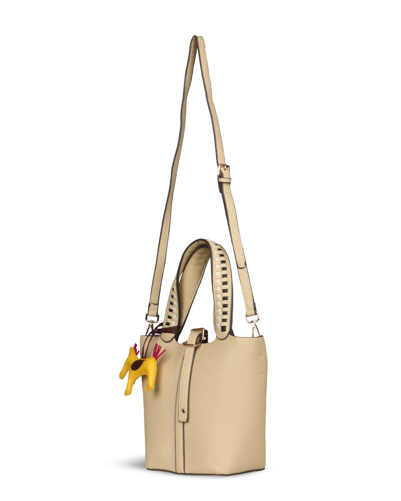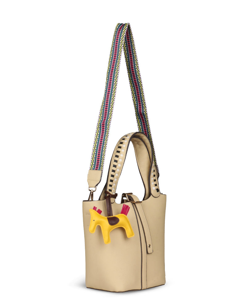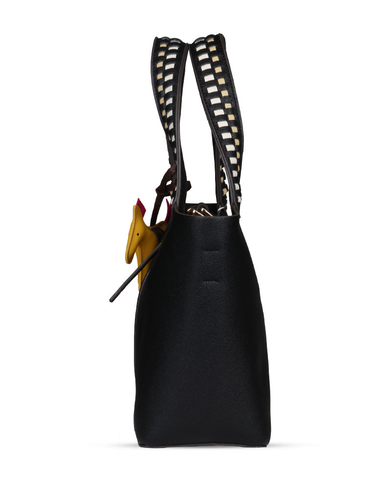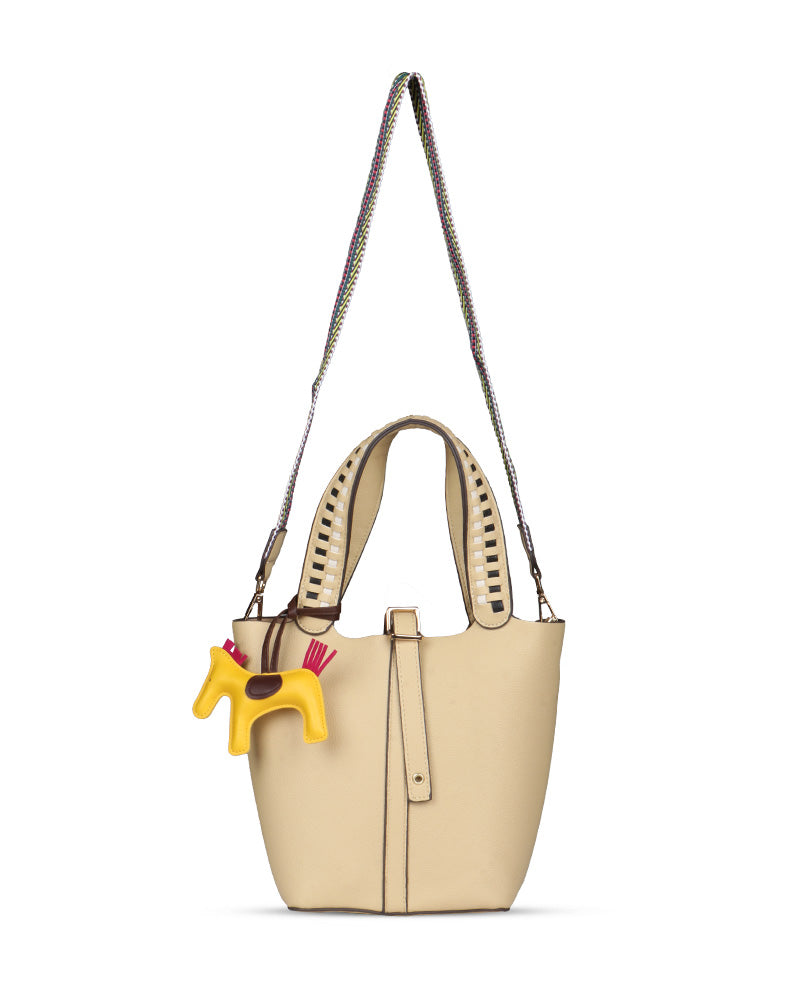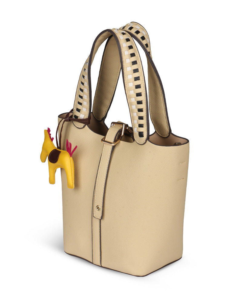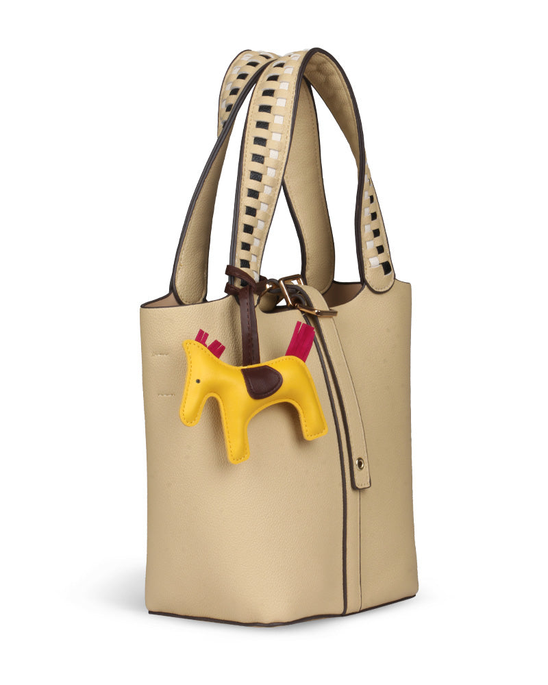 The Desert Ladder Bag is your go-to for contemporary elegance, boasting a luxurious pebbled finish and bold, contrasting woven handles. This versatile carryall is often seen adorned with a playful charm or scarf, making it effortlessly customizable. It's the ultimate accessory for the fashion-forward individual