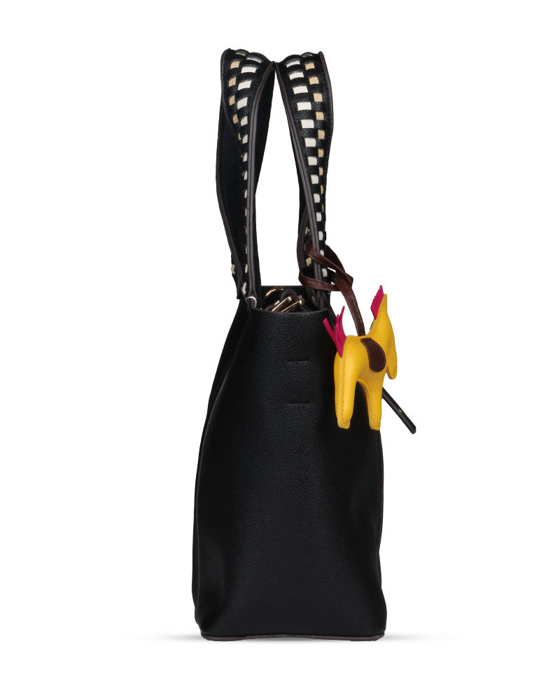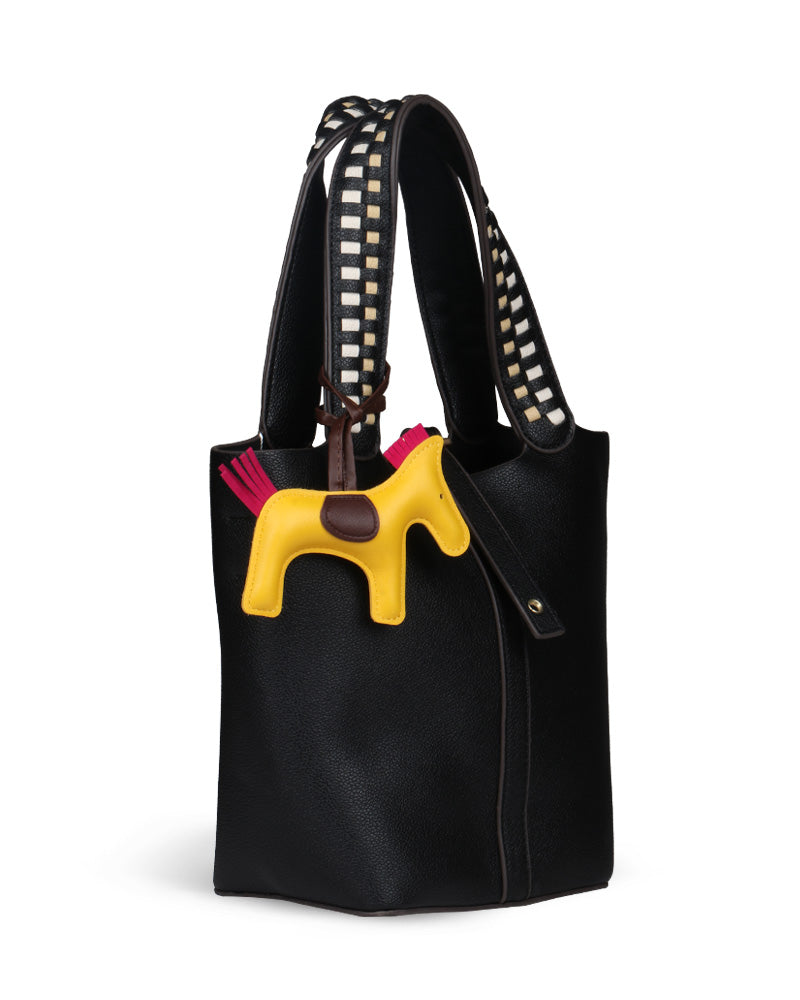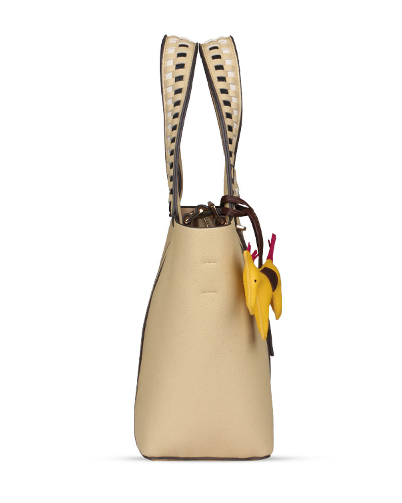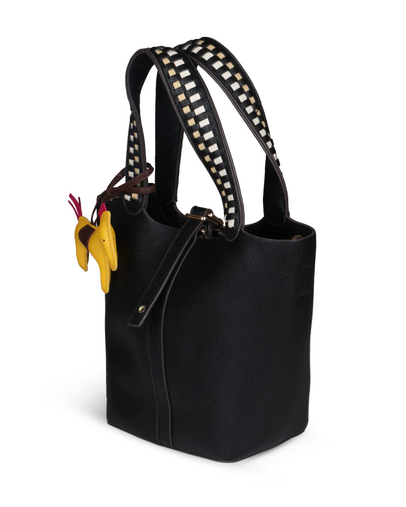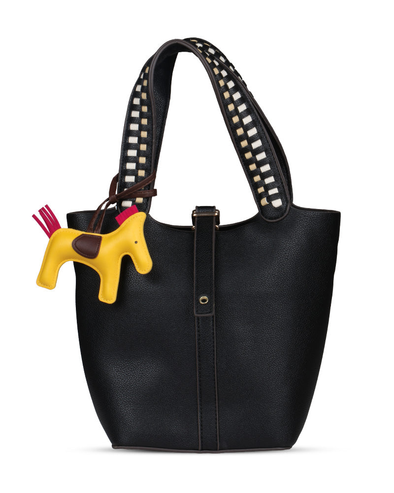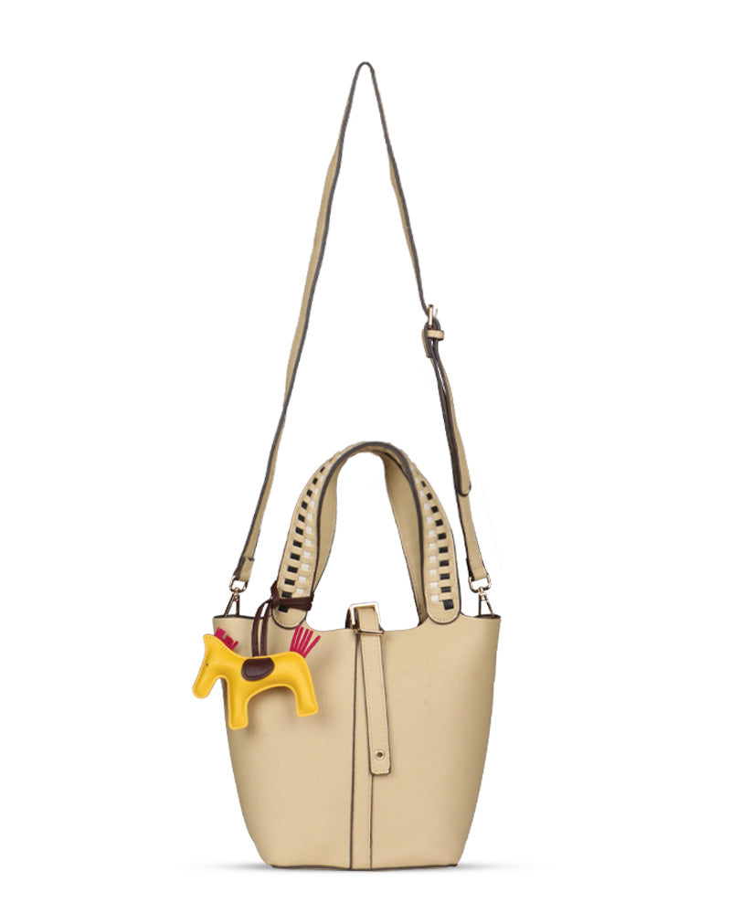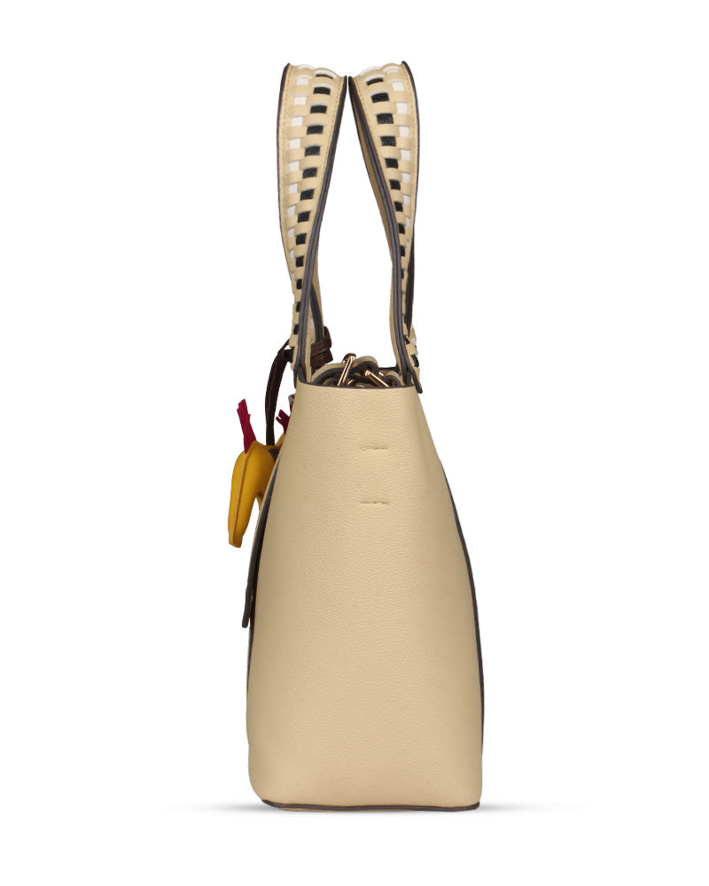 The Desert Ladder Bag is your go-to for contemporary elegance, boasting a luxurious pebbled finish and bold, contrasting woven handles. This versatile carryall is often seen adorned with a playful charm or scarf, making it effortlessly customizable. It's the ultimate accessory for the fashion-forward individual