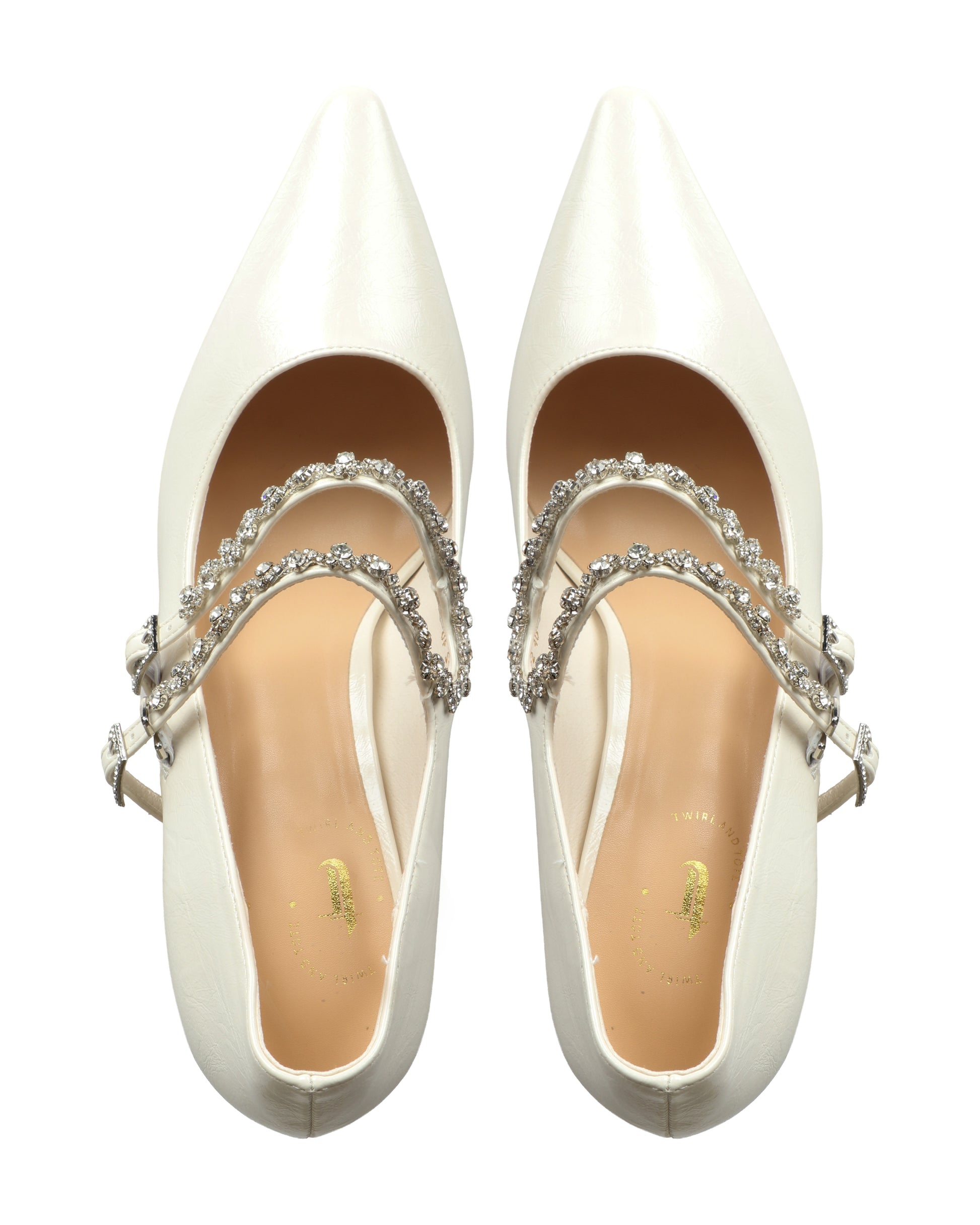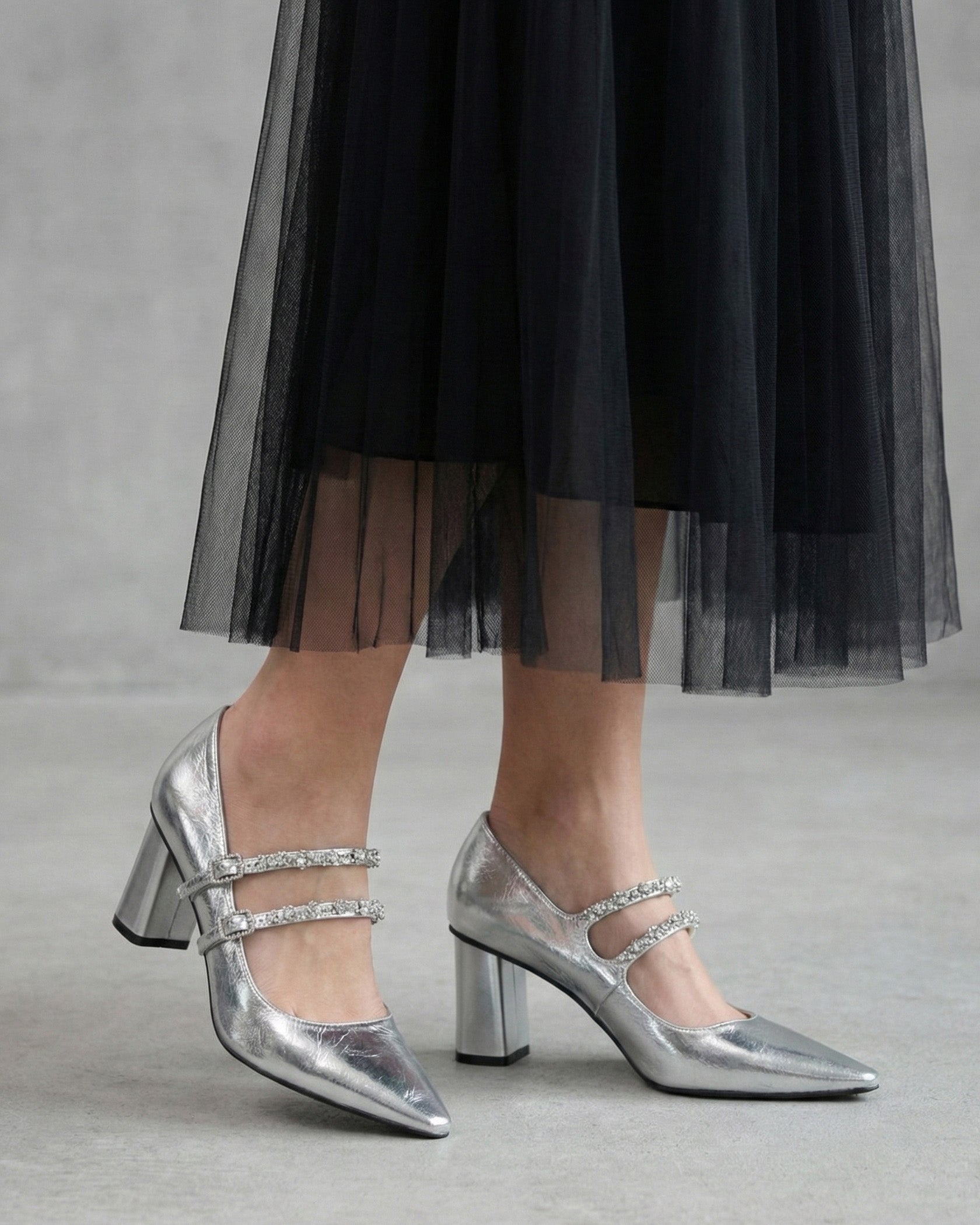 A pointed-toe pair with double crystal straps and a glossy metallic finish, giving a clean, polished, statement look.