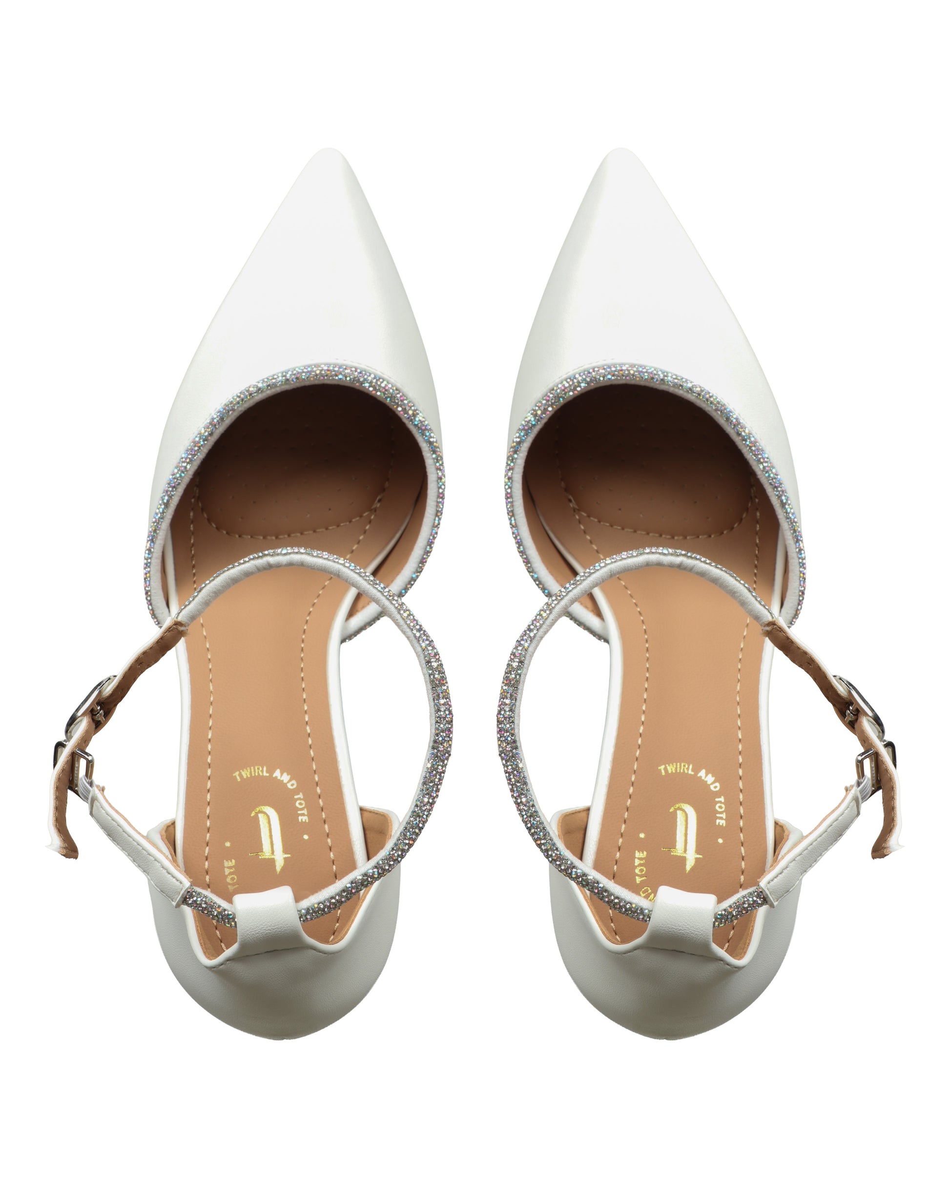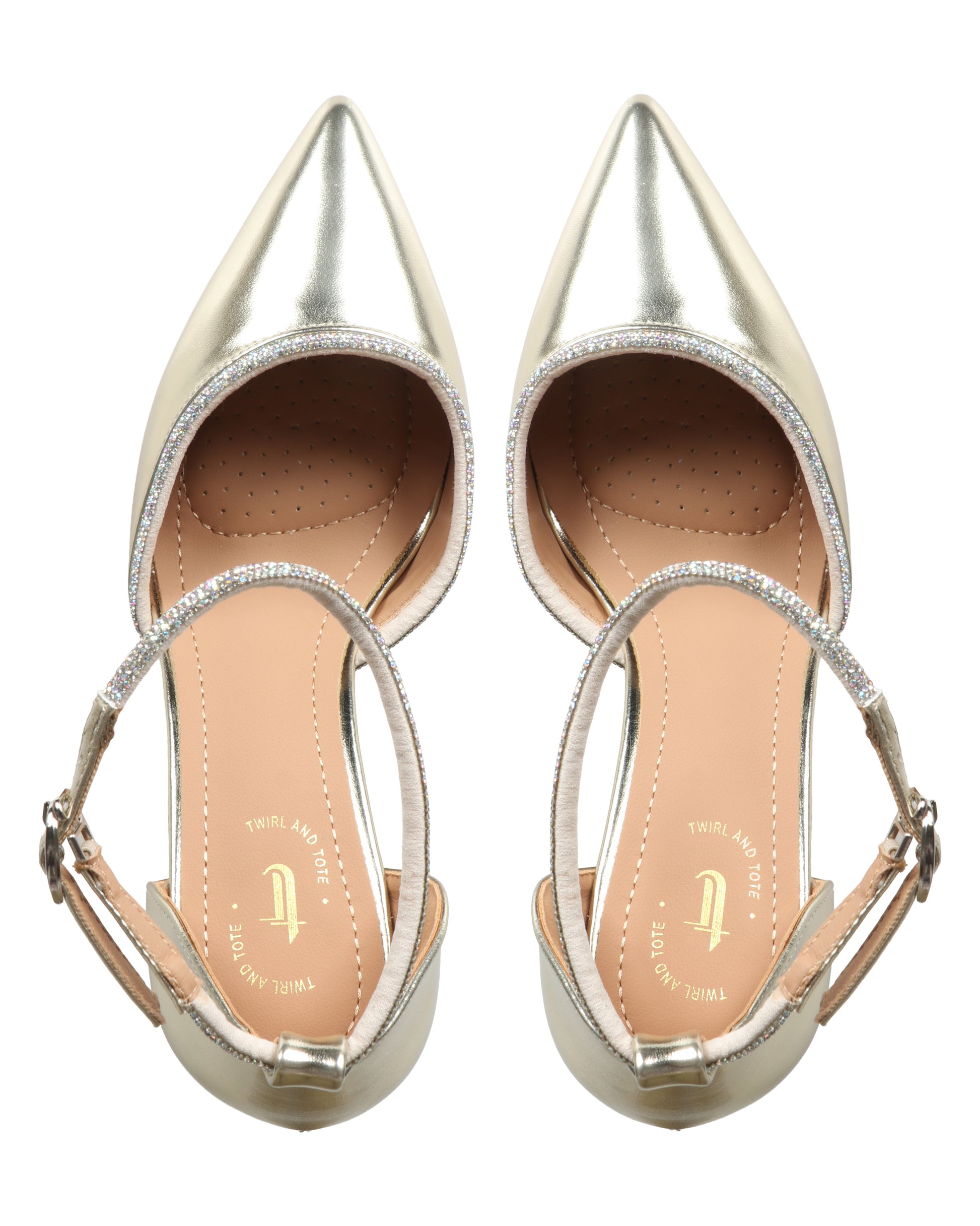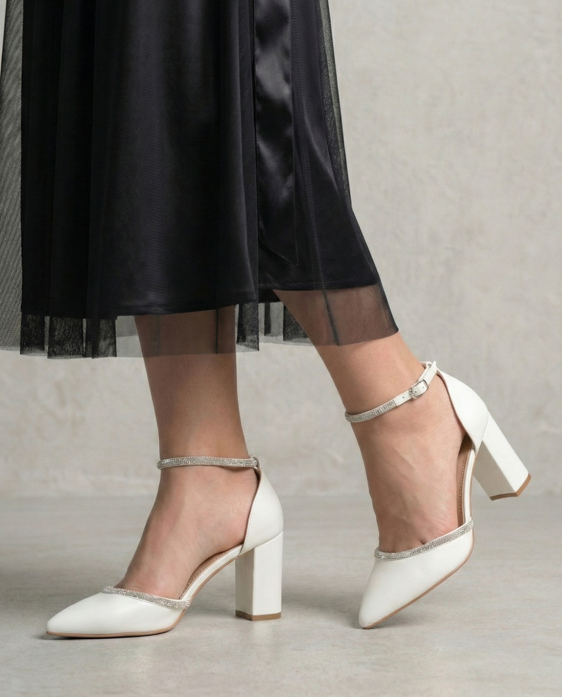 A sophisticated pump featuring a pointed toe, a supportive block heel, and delicate rhinestone piping for subtle sparkle.