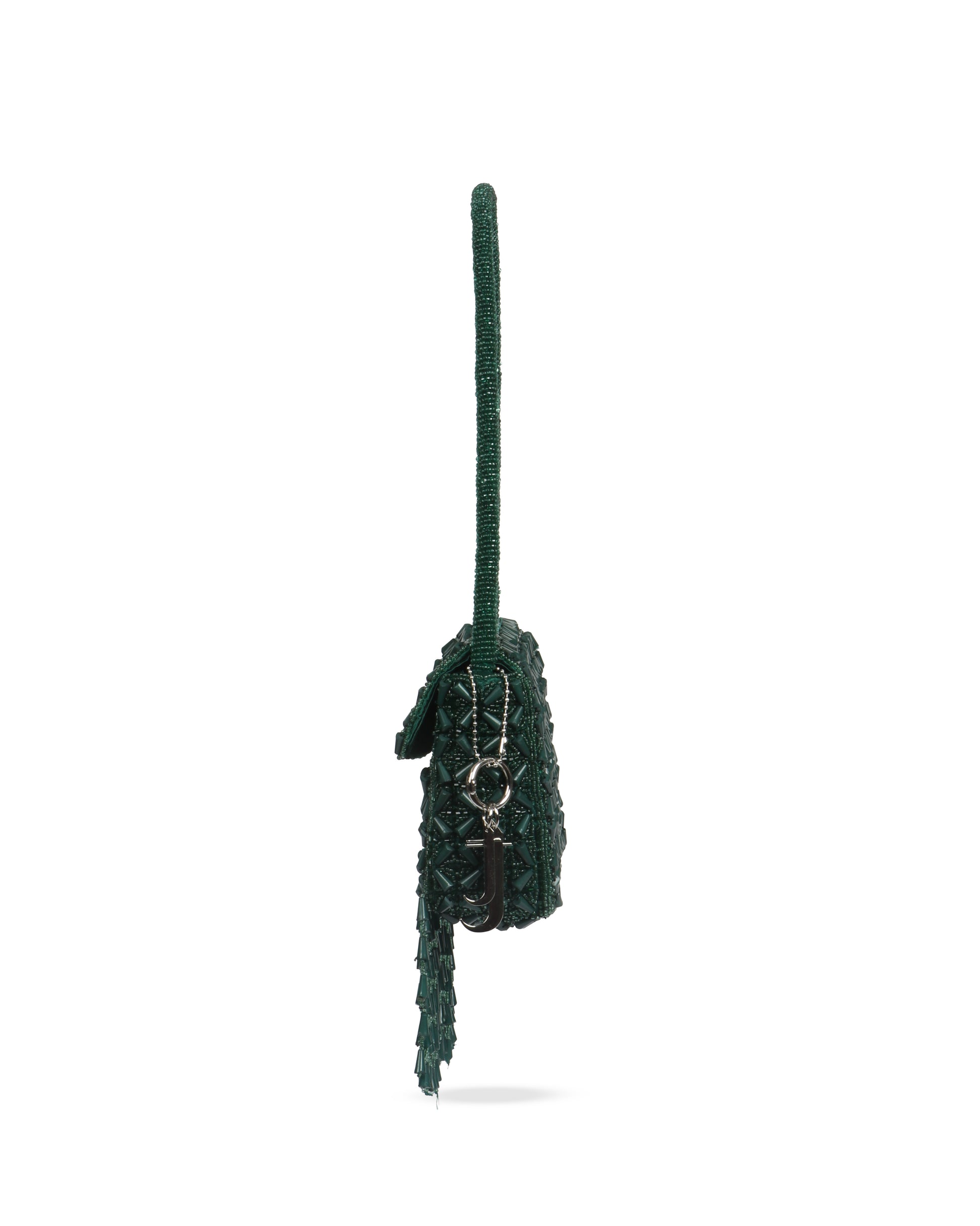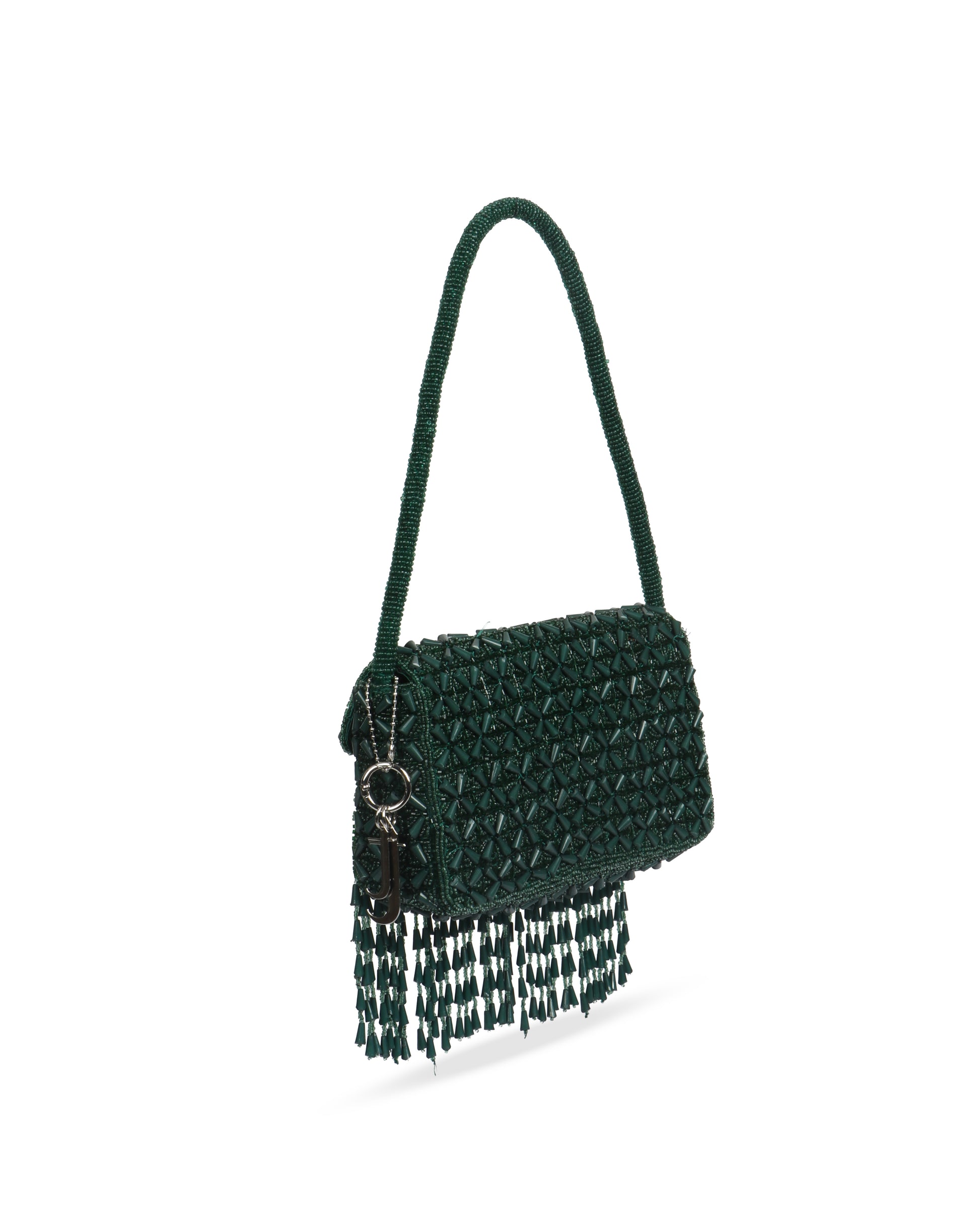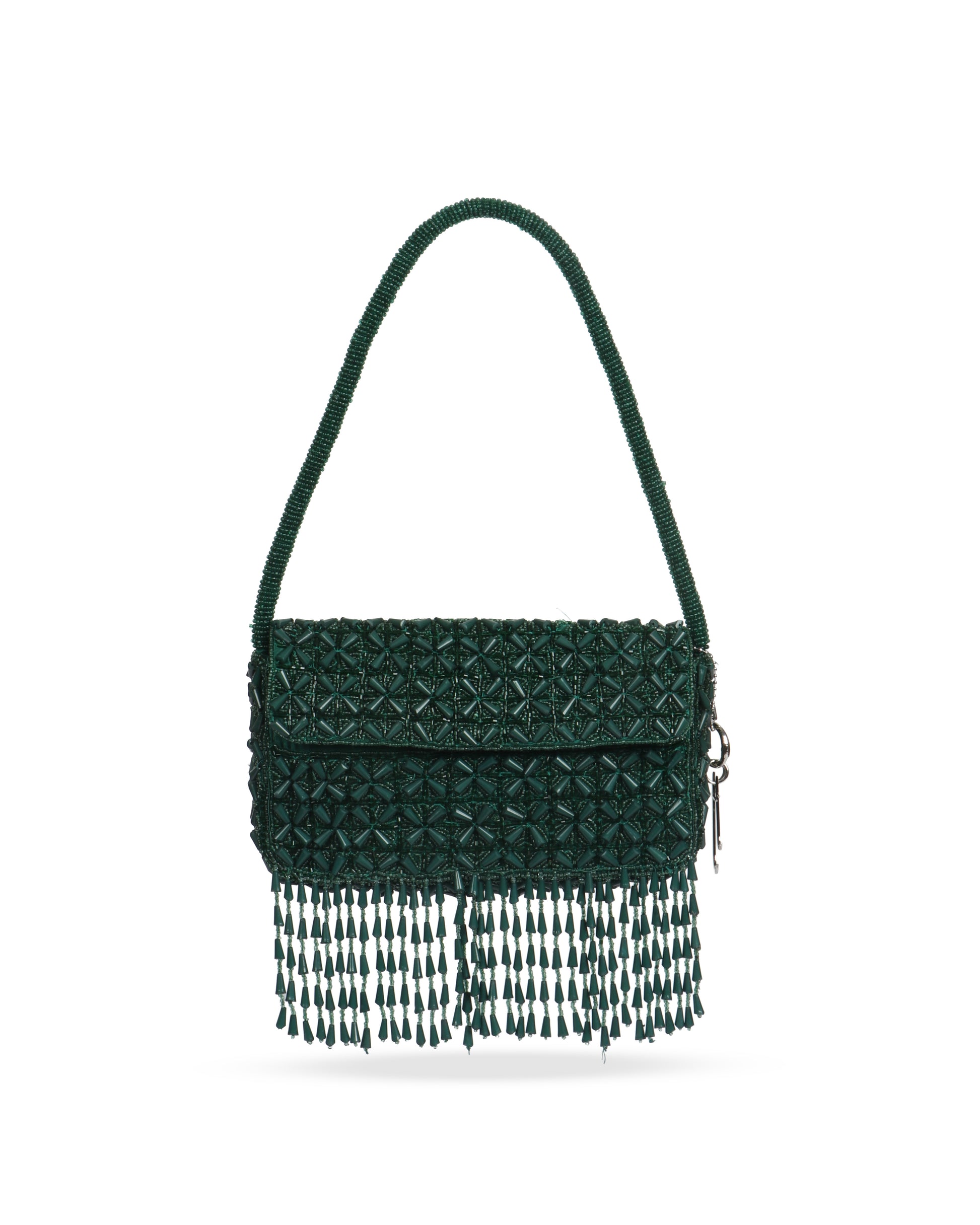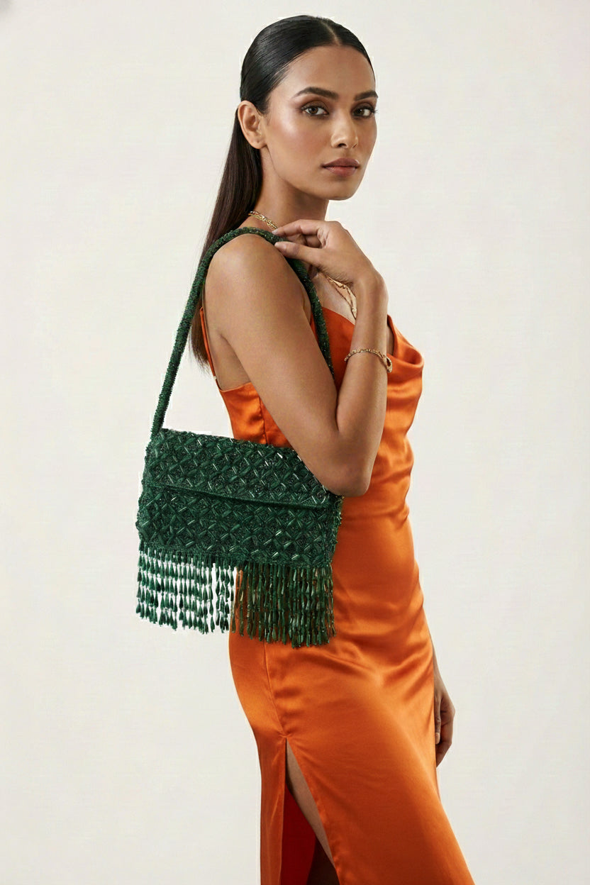 An elegant hand-embroidered design finished with delicate fringe accents.