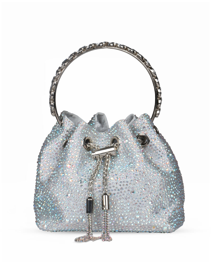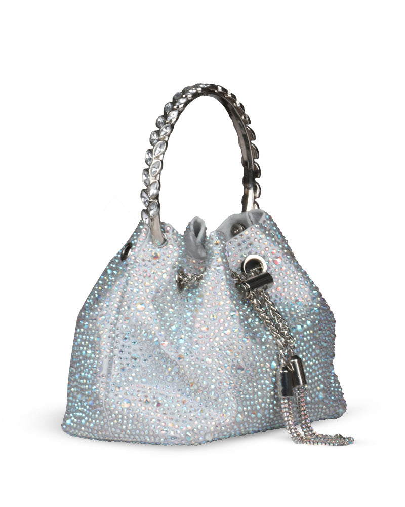 Shine brighter than the night sky with our Frozen Crystal Cascade Bucket, fully adorned in glittering rhinestones. Its playful drawstring closure and elegant top handle make it the perfect blend of fun and luxury.