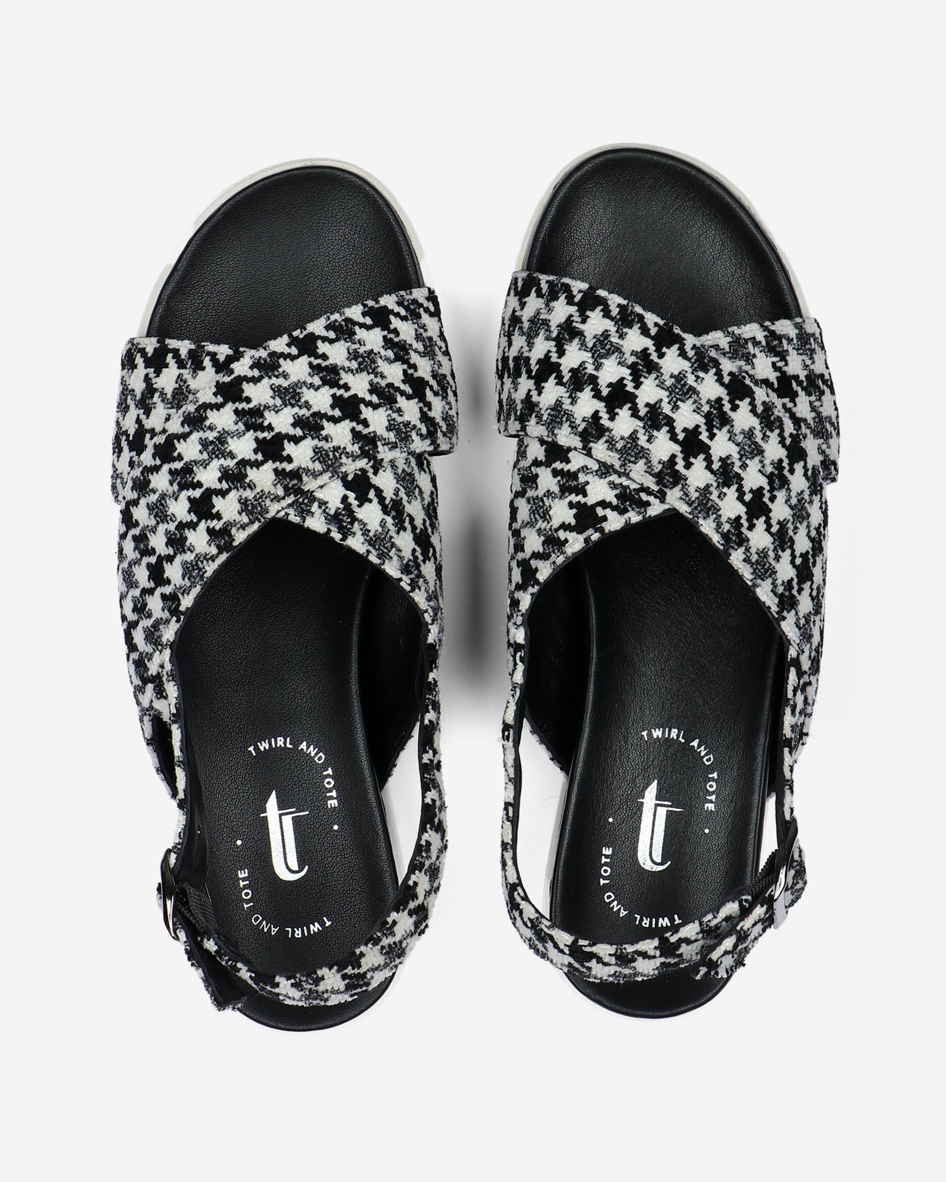 Classic meets comfort in these houndstooth patterned sandals, ideal for a sophisticated yet practical style.