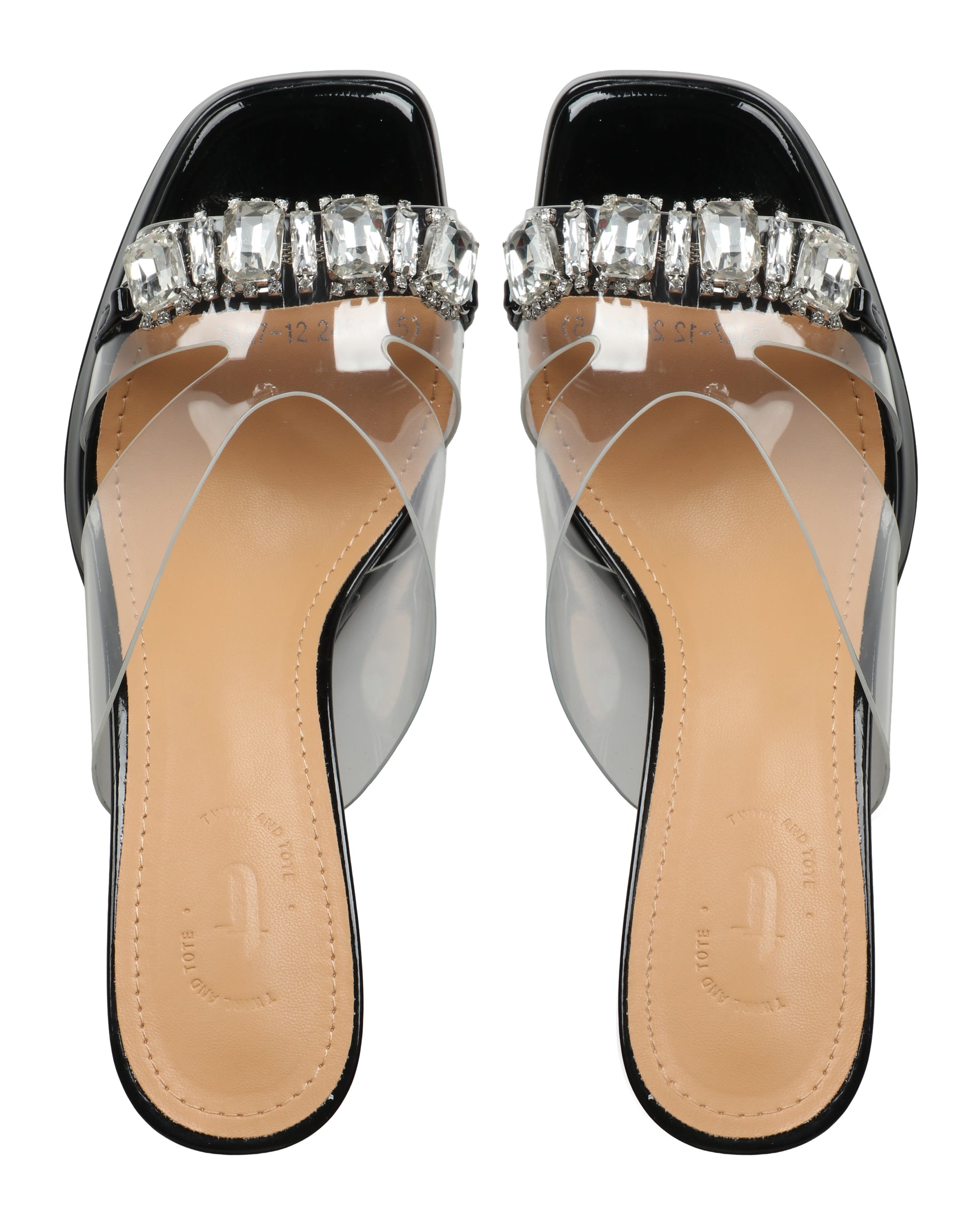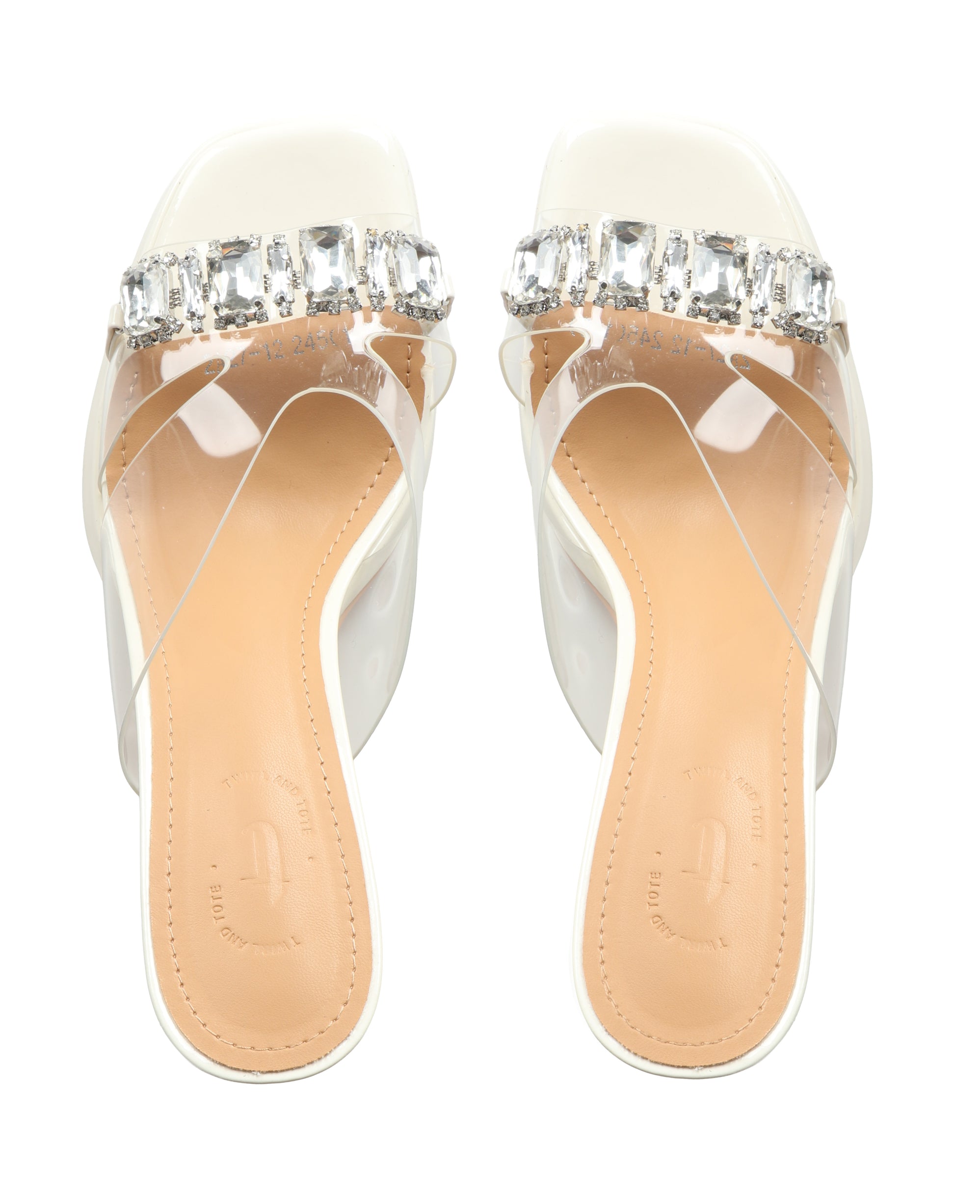 A chic clear-strap heel with bold crystal accents and a soft nude base, offering a clean and elevated look.