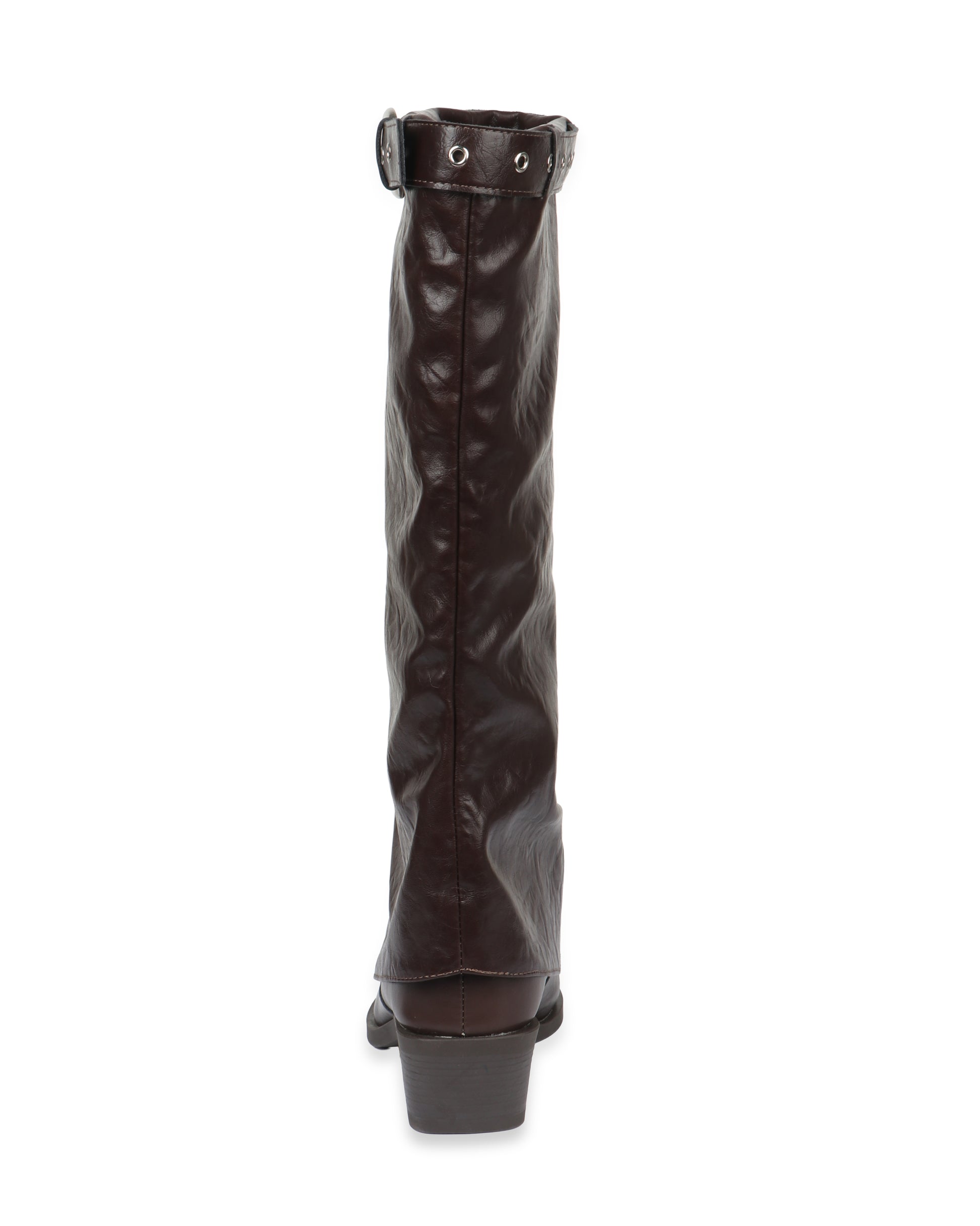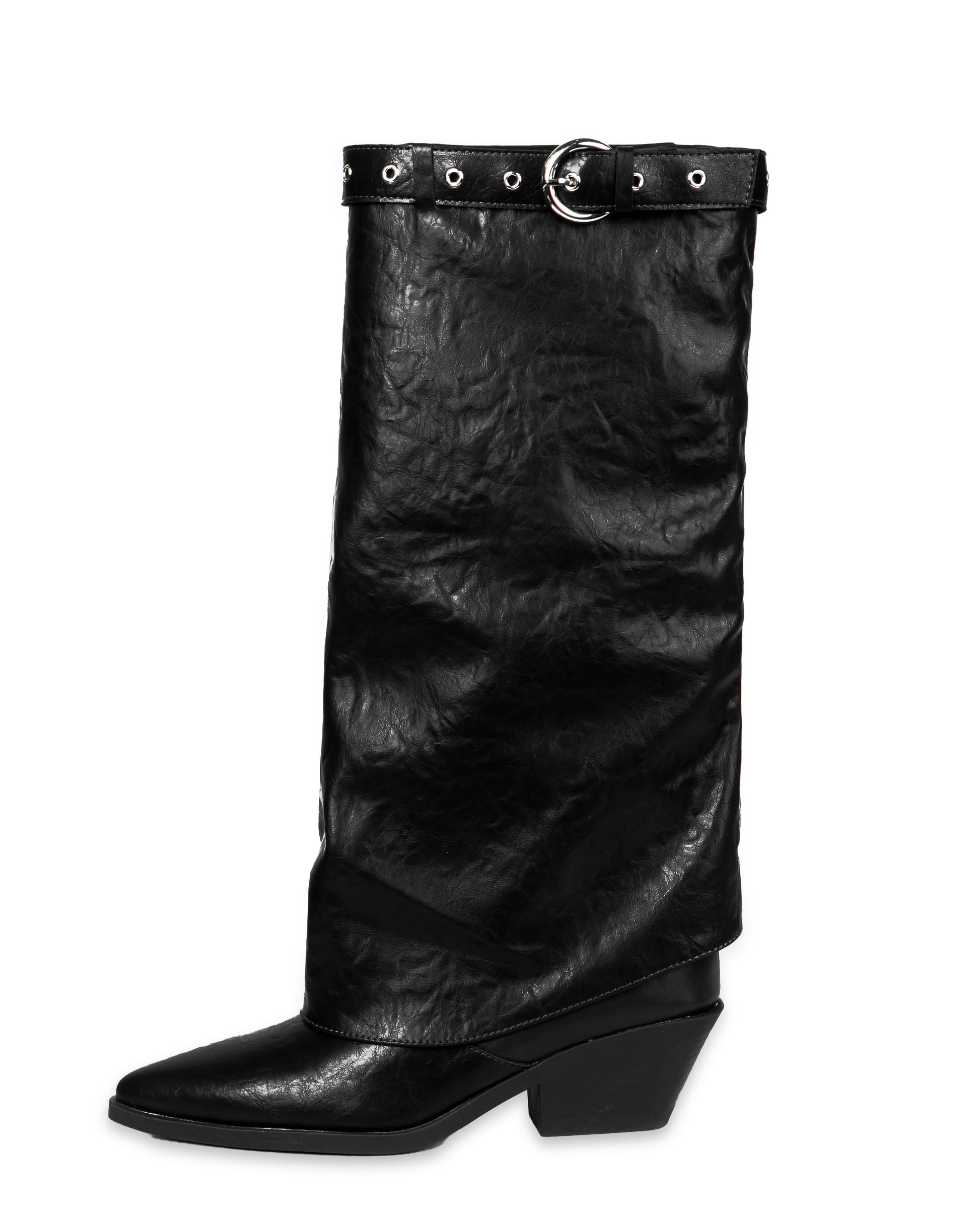 A dramatic, pointed-toe knee-high boot featuring metallic toe cap, slouchy shaft, and edgy stud detailing. It is made from vegan leather.