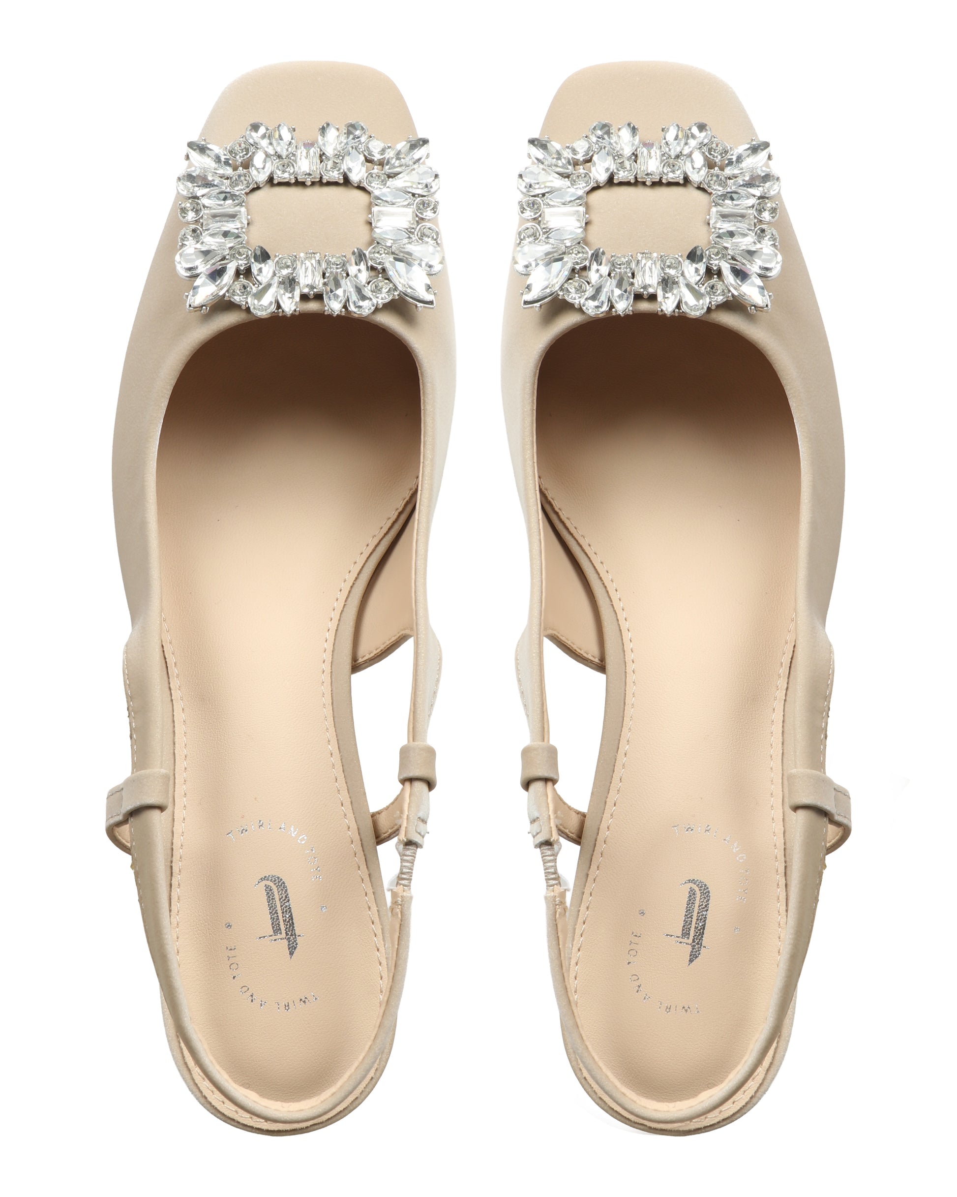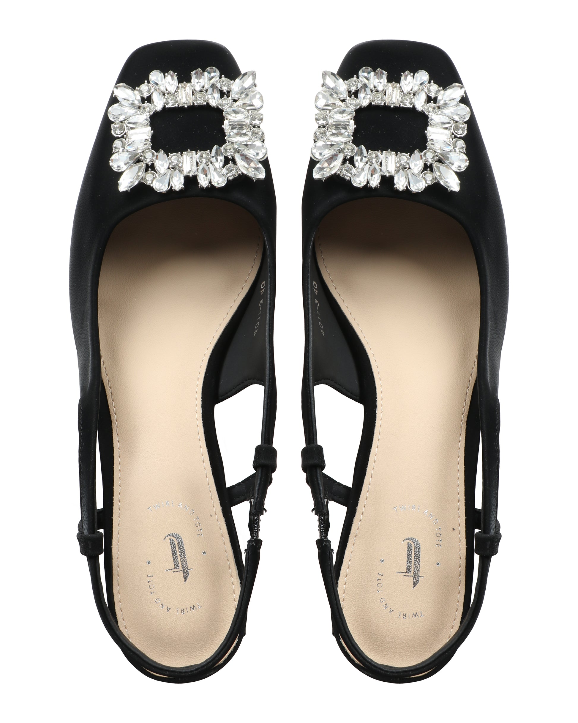 A polished slingback heel with a statement crystal buckle, designed for an elegant and refined look.