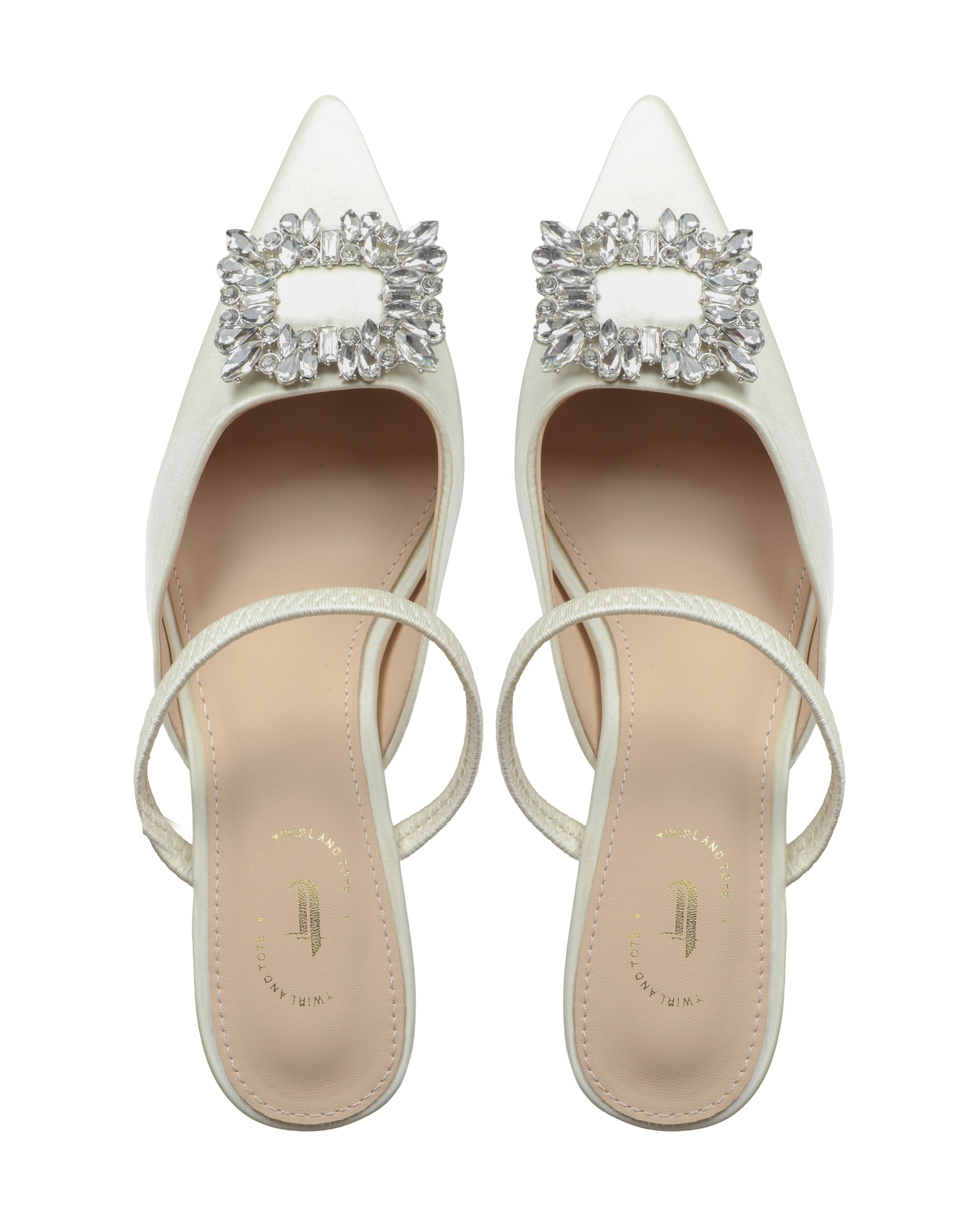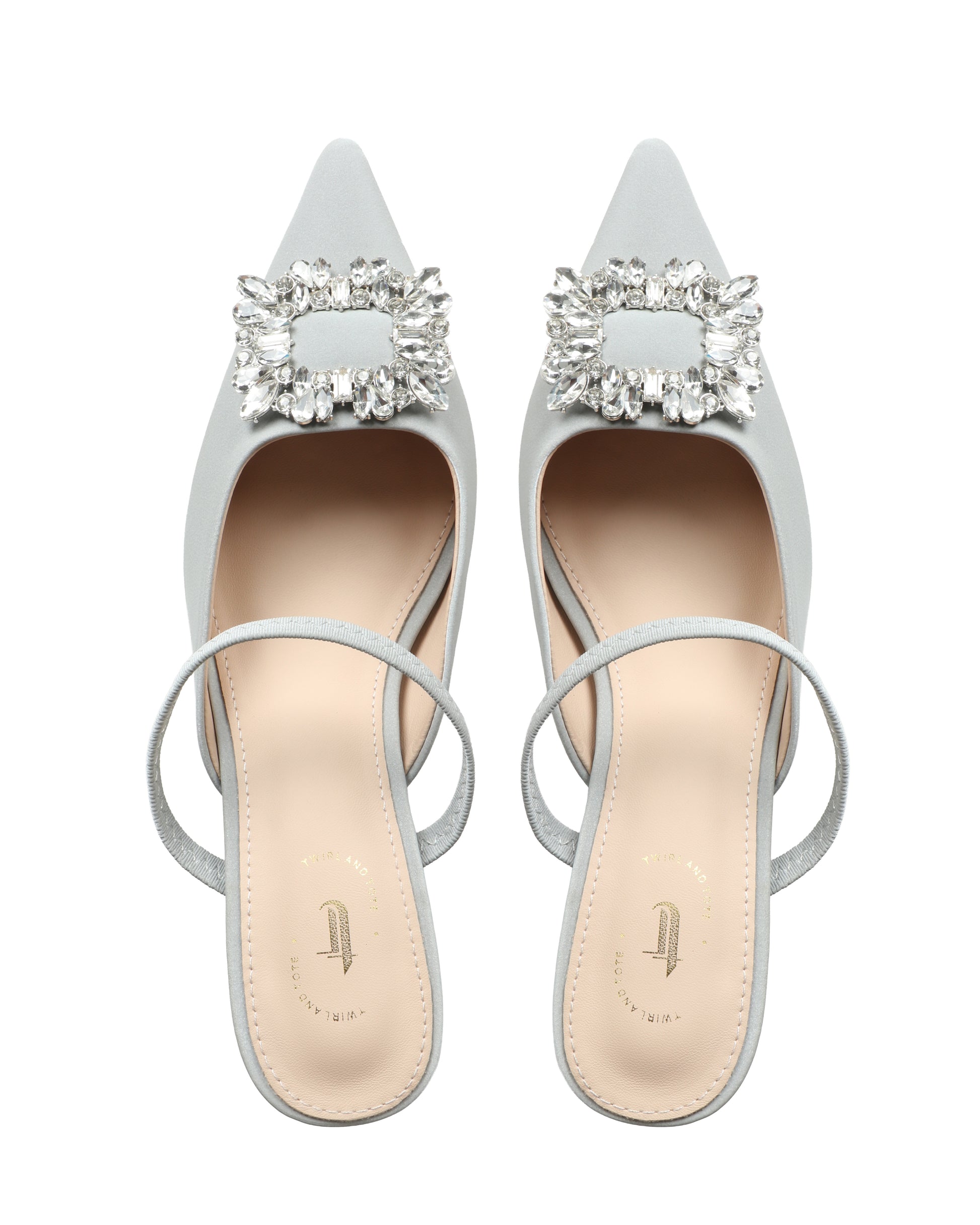 A sophisticated slingback mule featuring a sharp pointed toe and a brilliant crystal buckle, perfect for glamorous occasions.
