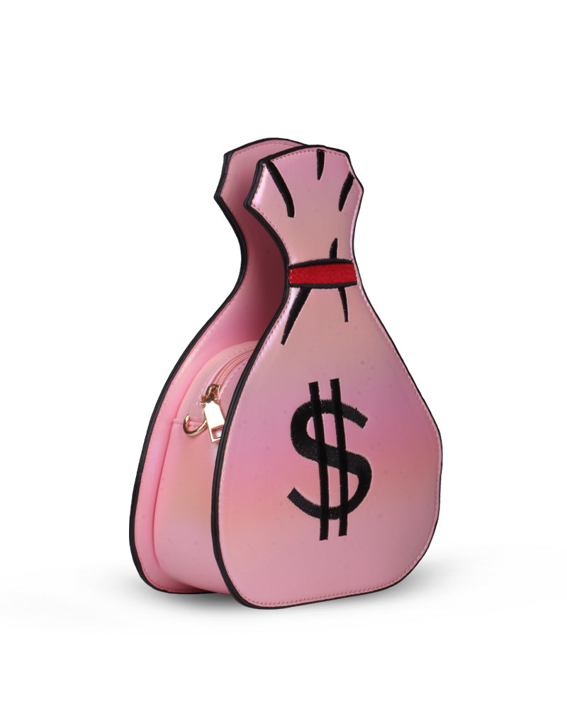 This fun and unique purse is cleverly shaped like a classic money bag, complete with a prominent dollar sign. Crafted with a stunning iridescent finish that catches the light beautifully, it's available in a vibrant pink .
