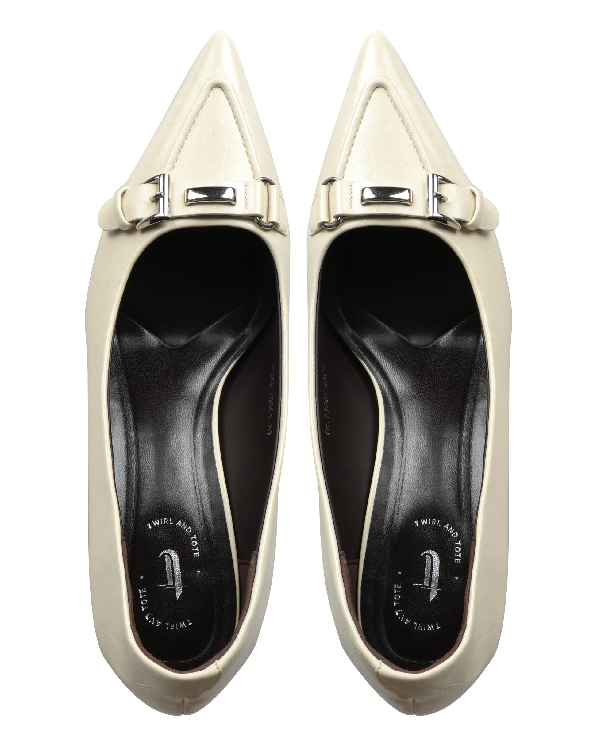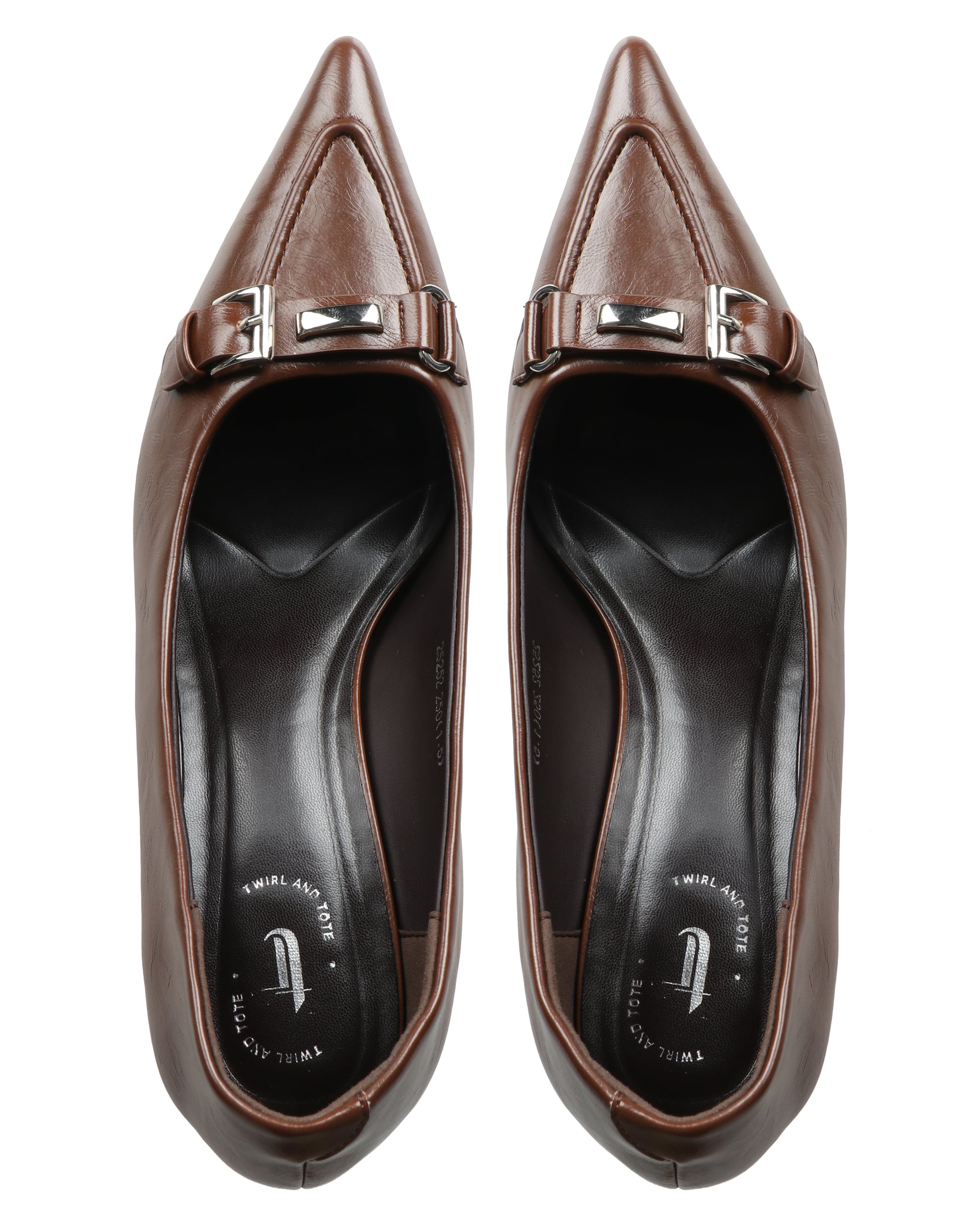 A polished pointed-toe pump defined by a modern silver buckle and a sharp silhouette for professional or formal wear.