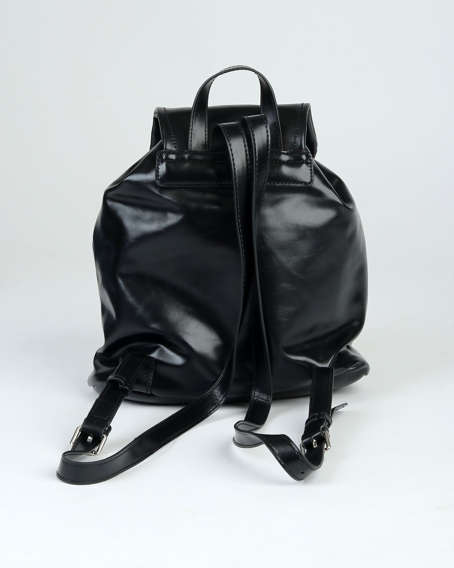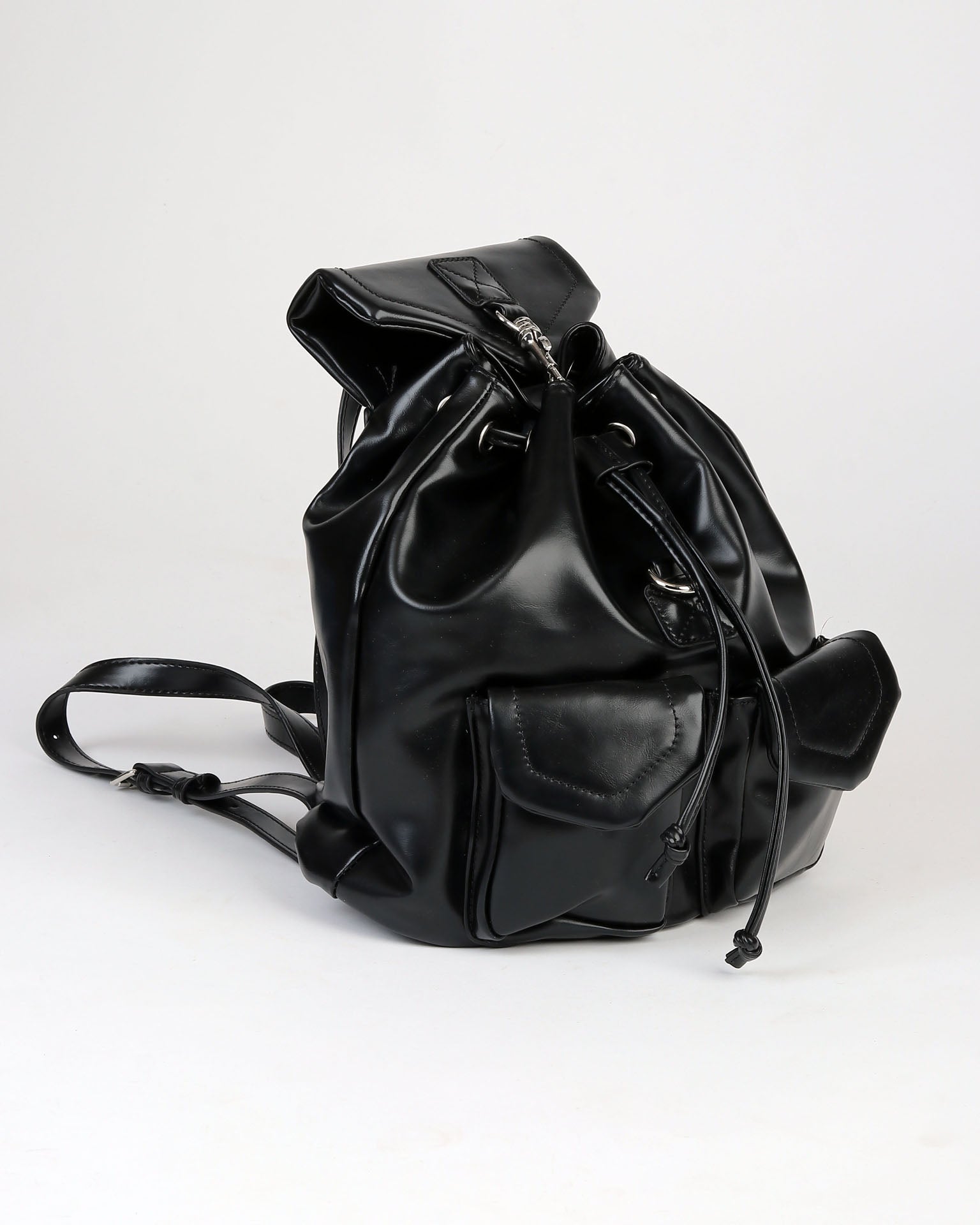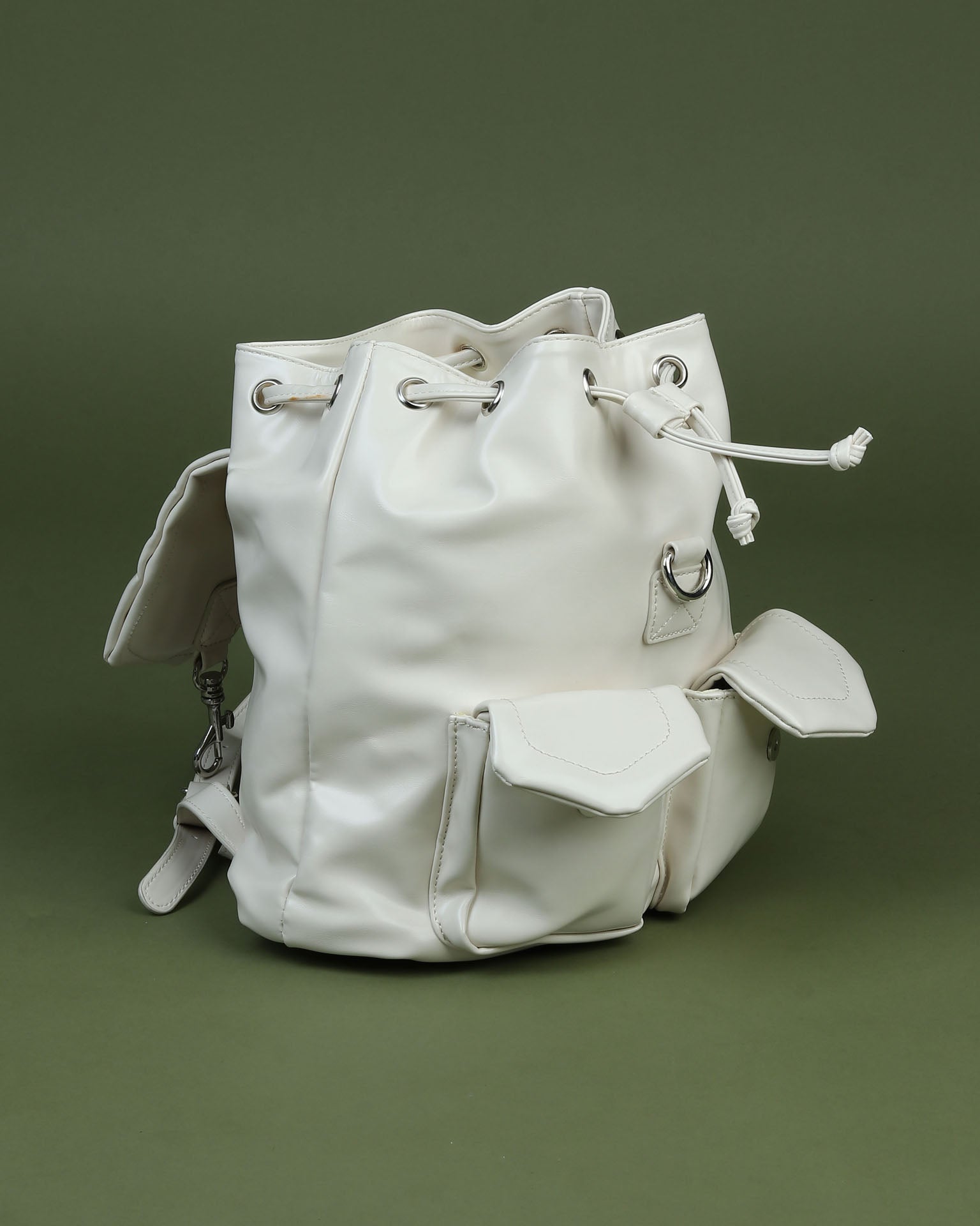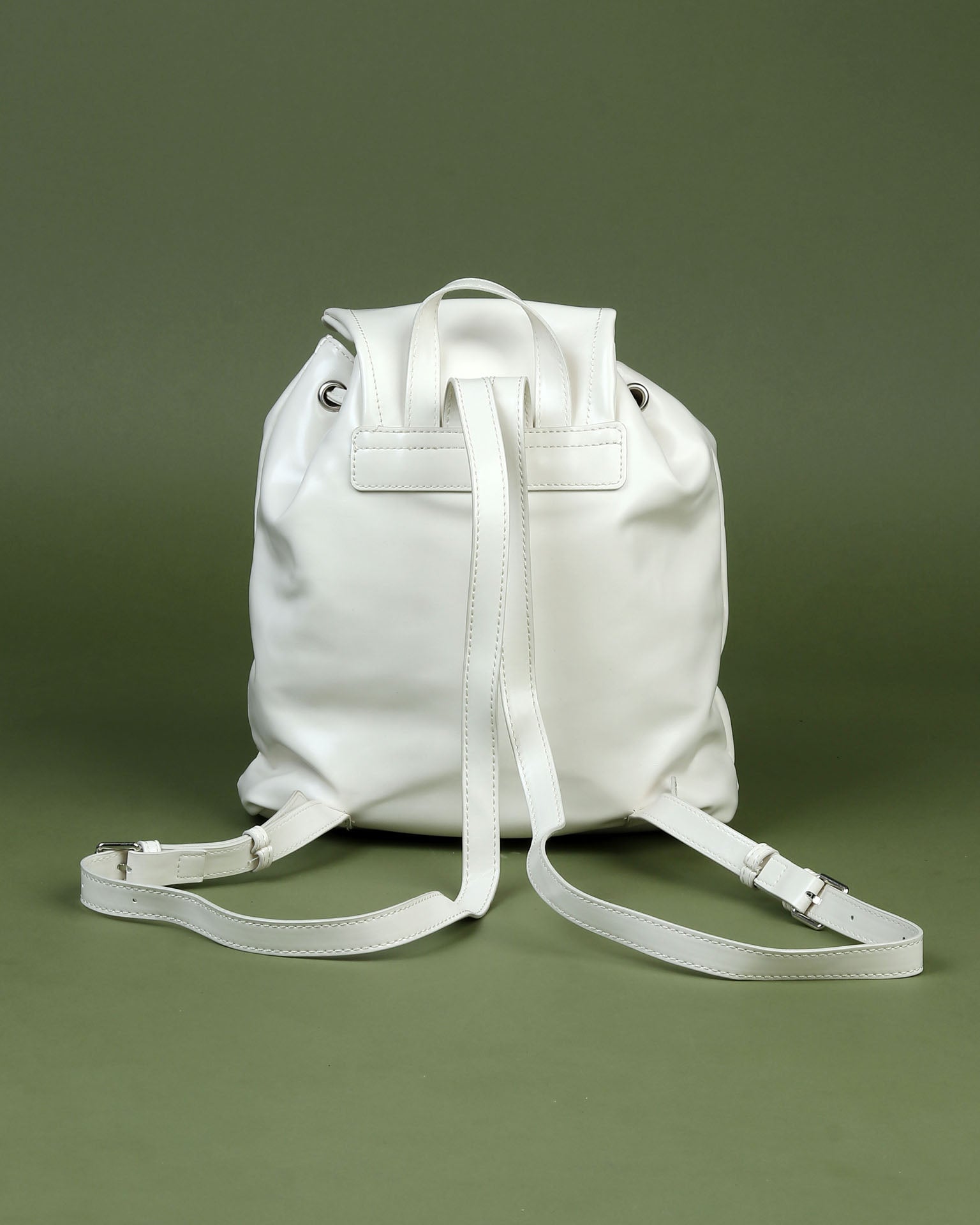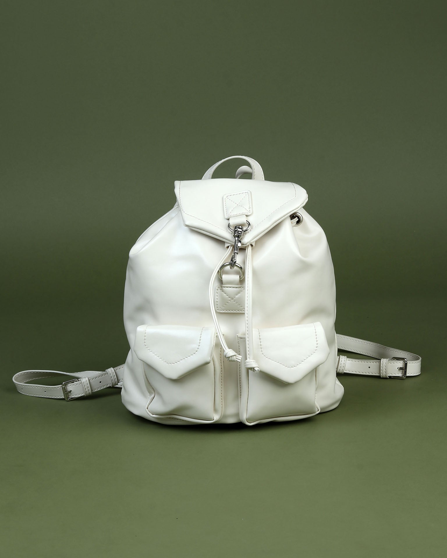 The backpack is fashioned from smooth, off-white leather, giving it a sleek and modern look. It features a cinched main compartment with a flap-over design, secured by a silver-tone metal clasp that adds a touch of industrial chic. The backpack also boasts two front pockets with snap closures for easy access to smaller items. Its adjustable straps ensure a comfortable fit, making it suitable for daily use in an urban setting, while its stylish design ensures it remains a fashionable choice for the contemporary adventurer..